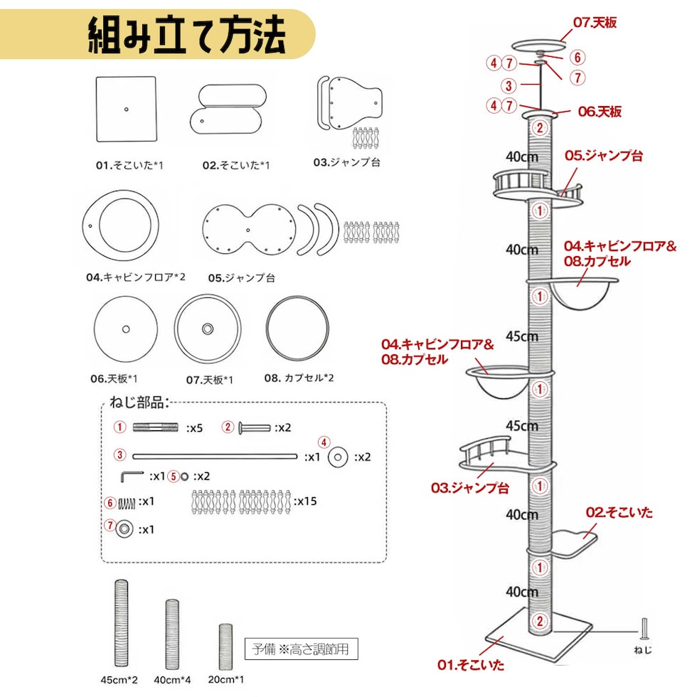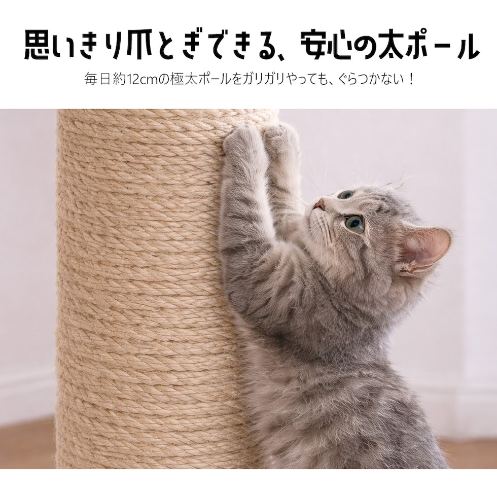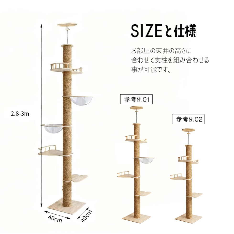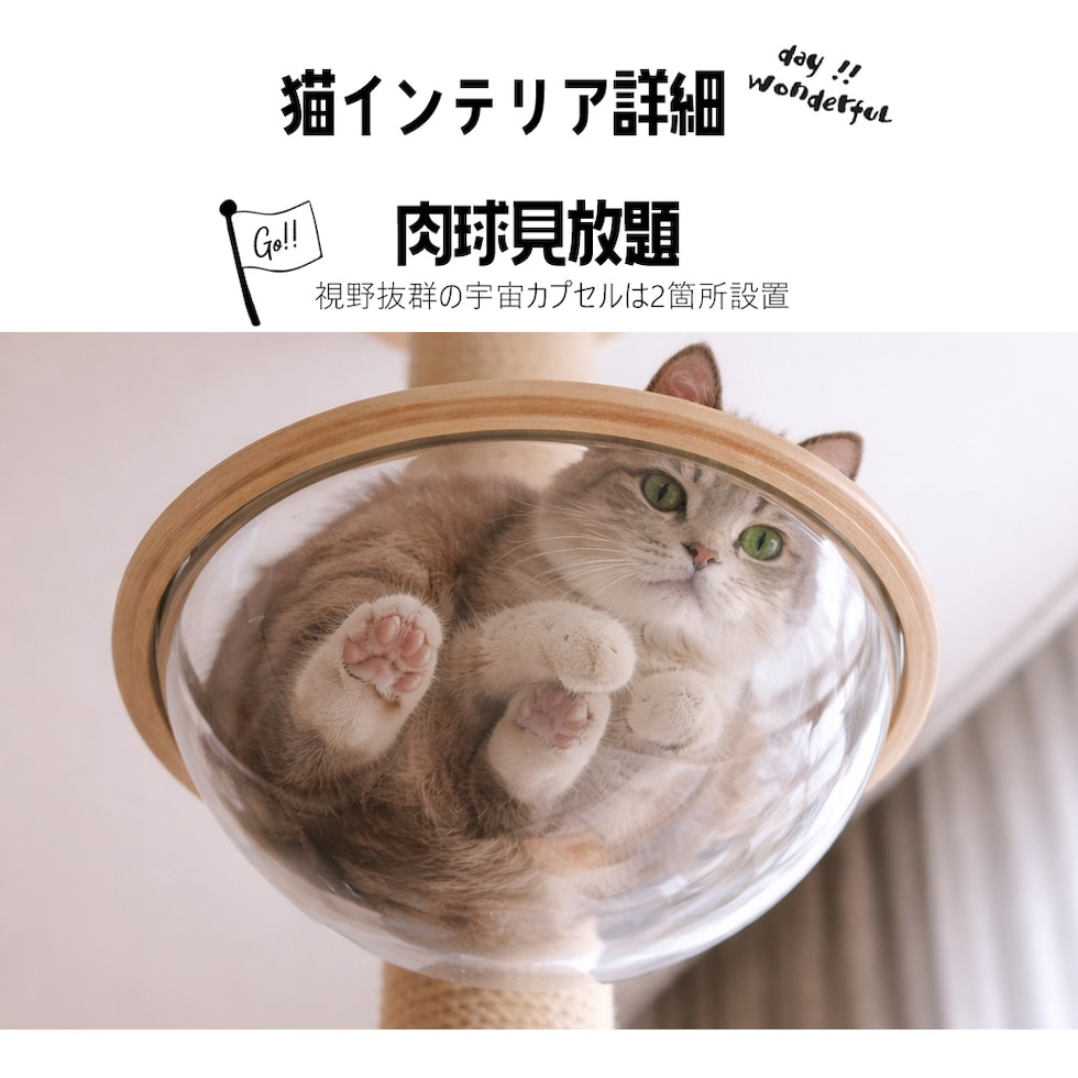 お部屋の縦空間を最大限に活かせる突っ張りタイプのキャットタワー。 透明な宇宙船ボウルは、猫がすっぽり収まってくつろげる特等席。 下から見上げると、丸くなって眠る姿が楽しめるのも魅力です。 支柱には直径約12cmの極太ポールを採用。 猫が思いきり爪とぎをしてもぐらつきにくく、 ジャンプや昇り降りも安心して行えます。 ポールの長さを組み替えることで、 天井の高さに合わせたレイアウト調整が可能。 賃貸住宅でも設置しやすく、床や壁に穴を開ける必要はありません。 <注意> ・組み立て時の破損等は返品・交換の対応はいたしかねます ・生産時期によって仕様変更がある場合がございます ・サイズにつきましては実数値と規定値で多少の誤差が生じますのであらかじめご了承ください ・各パーツが不足している場合は、【商品到着後7日以内】にメールにてご連絡ください |