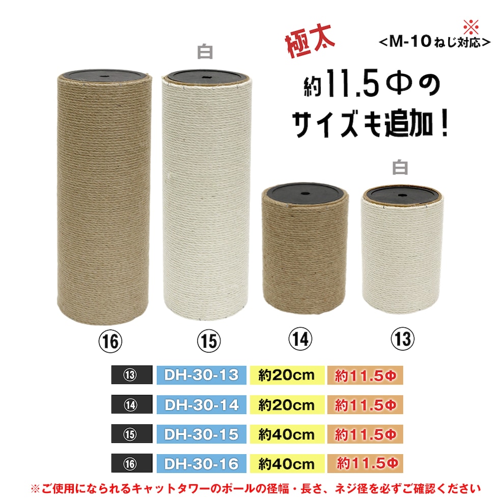| こちらのページ内商品は、キャットタワーの爪とぎポール(交換用)となります。 ※画像のネジは付属していません。交換用ポールのみの販売となります。 <注意> ・組み立て時の破損等は返品・交換の対応はいたしかねます ・生産時期によって仕様変更がある場合がございます ・サイズにつきましては実数値と規定値で多少の誤差が生じますのであらかじめご了承ください ・各パーツが不足している場合は、【商品到着後7日以内】にメールにてご連絡ください |
