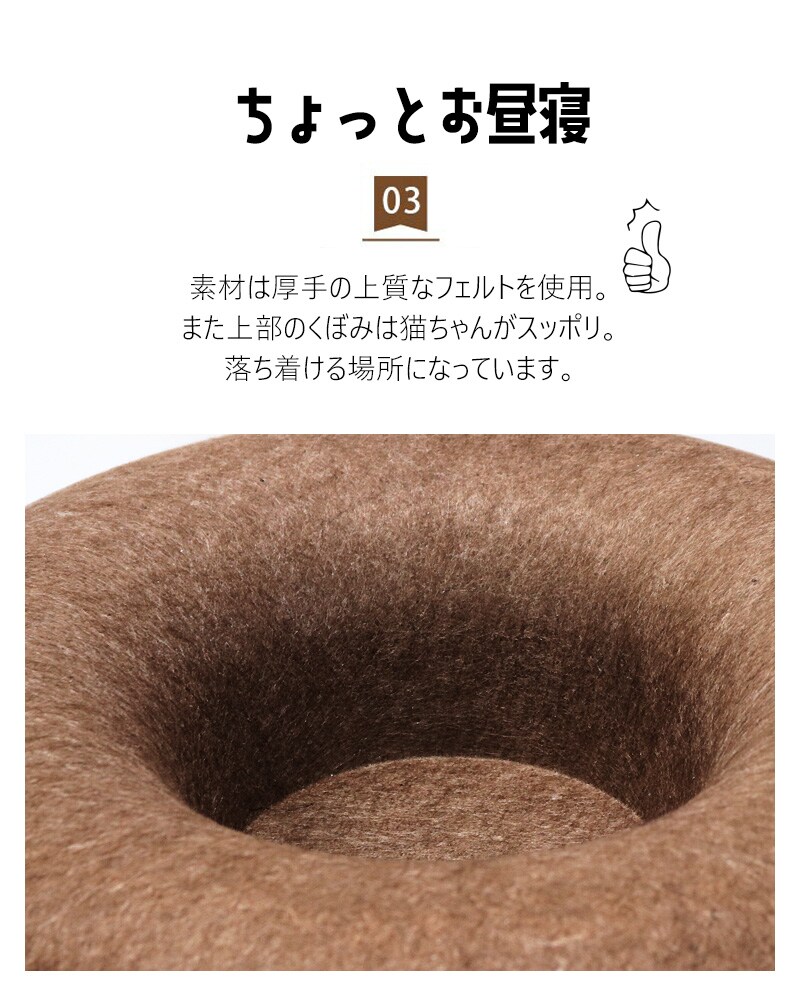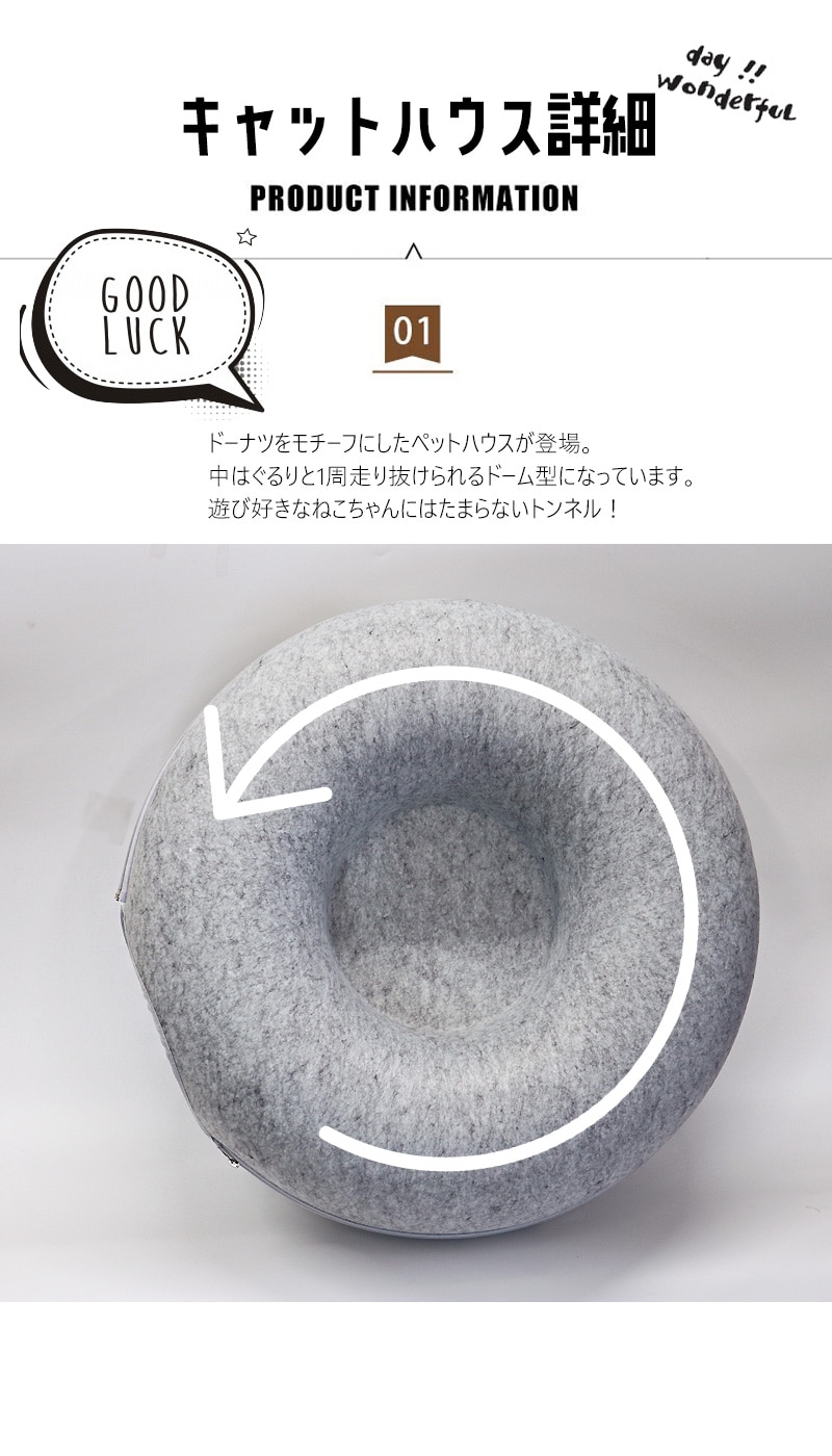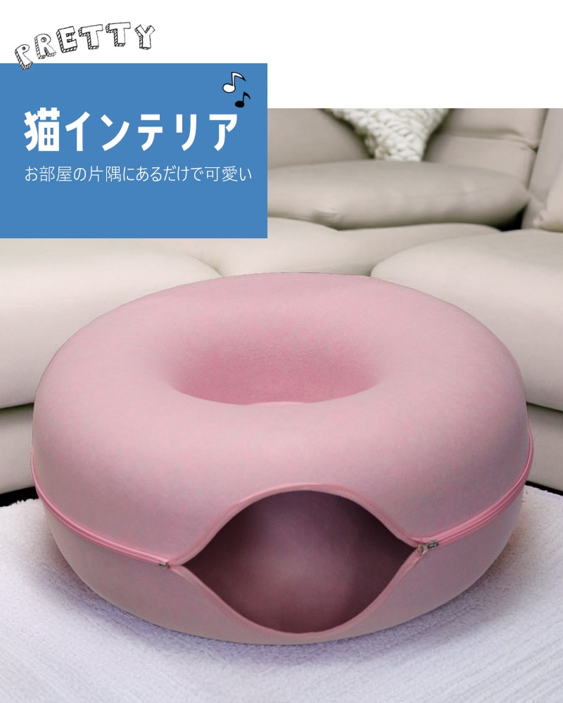 【ねこちゃんが落ち着ける場所】 ドーナツをモチーフにしたペットハウスが登場。 中はぐるりと1周走り抜けられるドーム型になっています。 遊び好きなねこちゃんにはたまらないトンネル! また上部のくぼみは猫ちゃんがスッポリ。落ち着ける場所になっています。 【いつでも清潔に】 ファスナーで簡単に取り外しが出来るので、お掃除も楽々! 【インテリアとしてもかわいい】 お部屋の片隅に置いていても可愛く、インテリアとしてもお部屋に自然と馴染んでくれます。 <注意> ・組み立て時の破損等は返品・交換の対応はいたしかねます ・生産時期によって仕様変更がある場合がございます ・サイズにつきましては実数値と規定値で多少の誤差が生じますのであらかじめご了承ください ・各パーツが不足している場合は、【商品到着後7日以内】にメールにてご連絡ください |