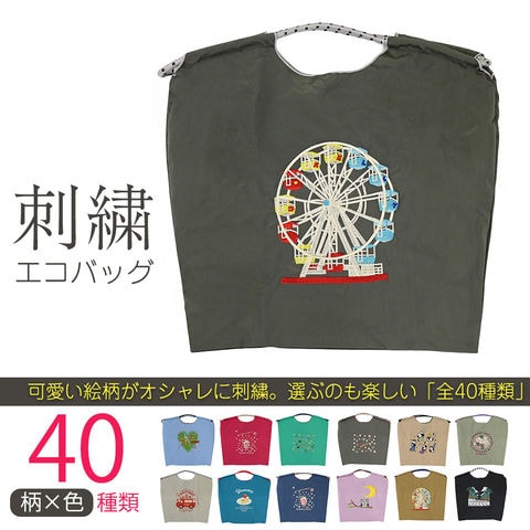 刺繍エコバッグ トートバッグ 折りたたみ 肩掛け 巾着 生活防水 コンパクト 軽量 おしゃれ ショッピングバッグ マイバッグ お買い物バッグ スポーツクラブ レジ袋代用 トラベルバッグ メール便 【ecobag】24/観覧車カーキ トラベルソムリエ t-trag7