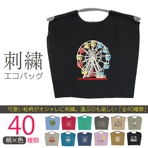 刺繍エコバッグ トートバッグ 折りたたみ 肩掛け 巾着 生活防水 コンパクト 軽量 おしゃれ ショッピングバッグ マイバッグ お買い物バッグ スポーツクラブ レジ袋代用 トラベルバッグ メール便 【ecobag】26/観覧車ブラック トラベルソムリエ t-trag7