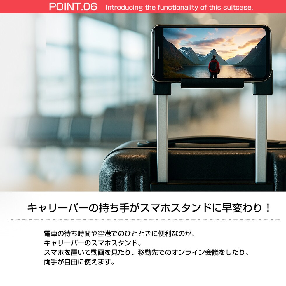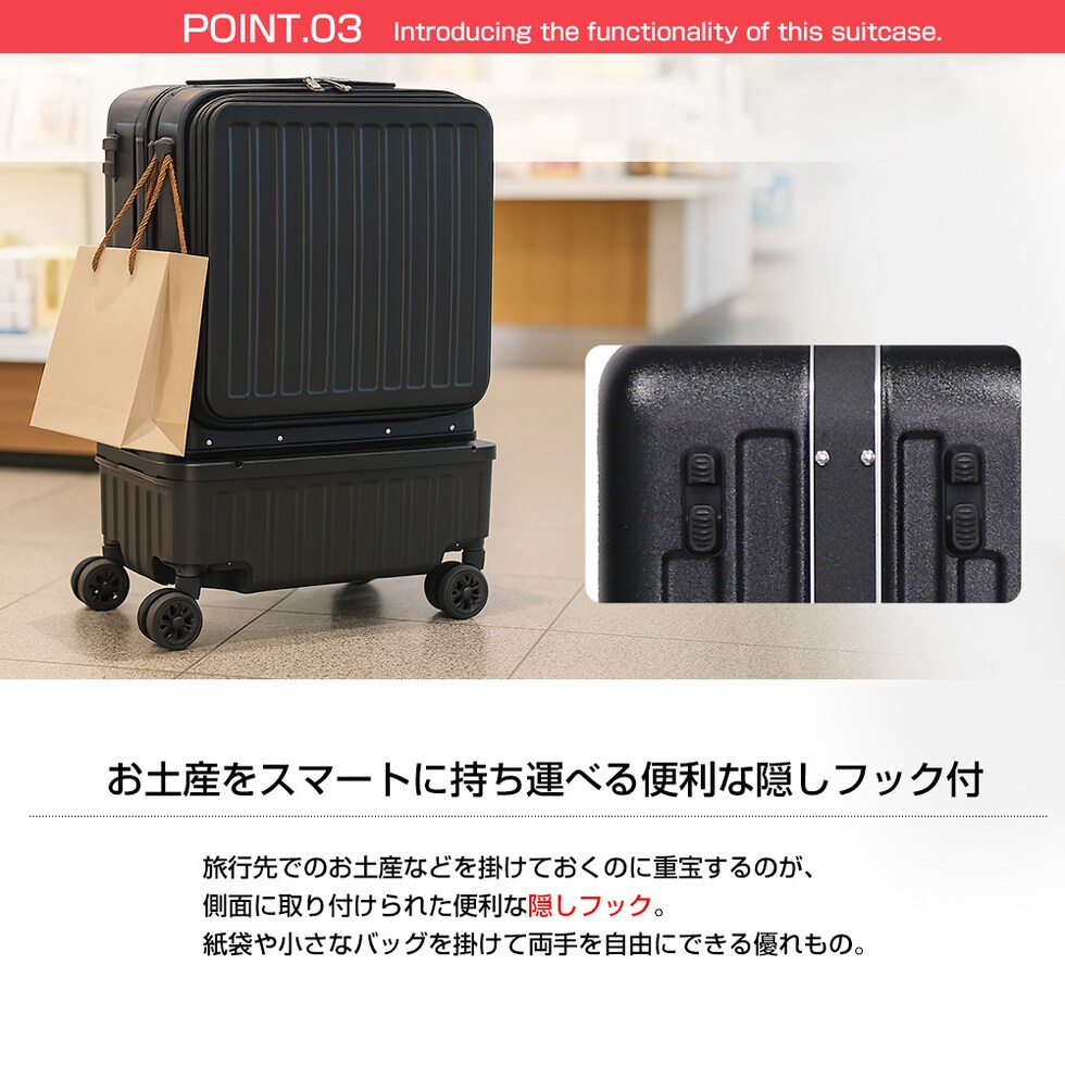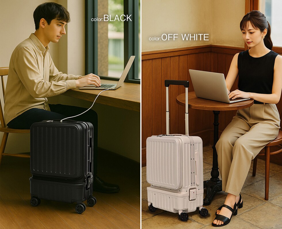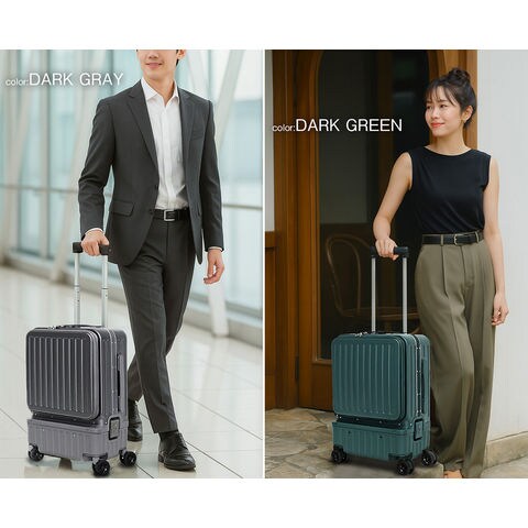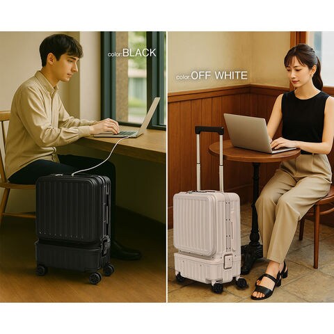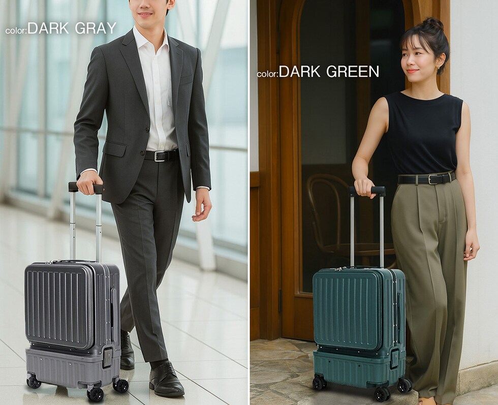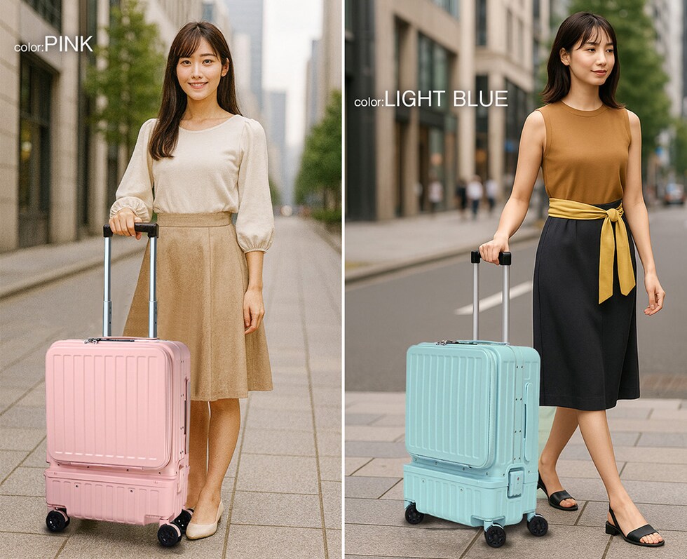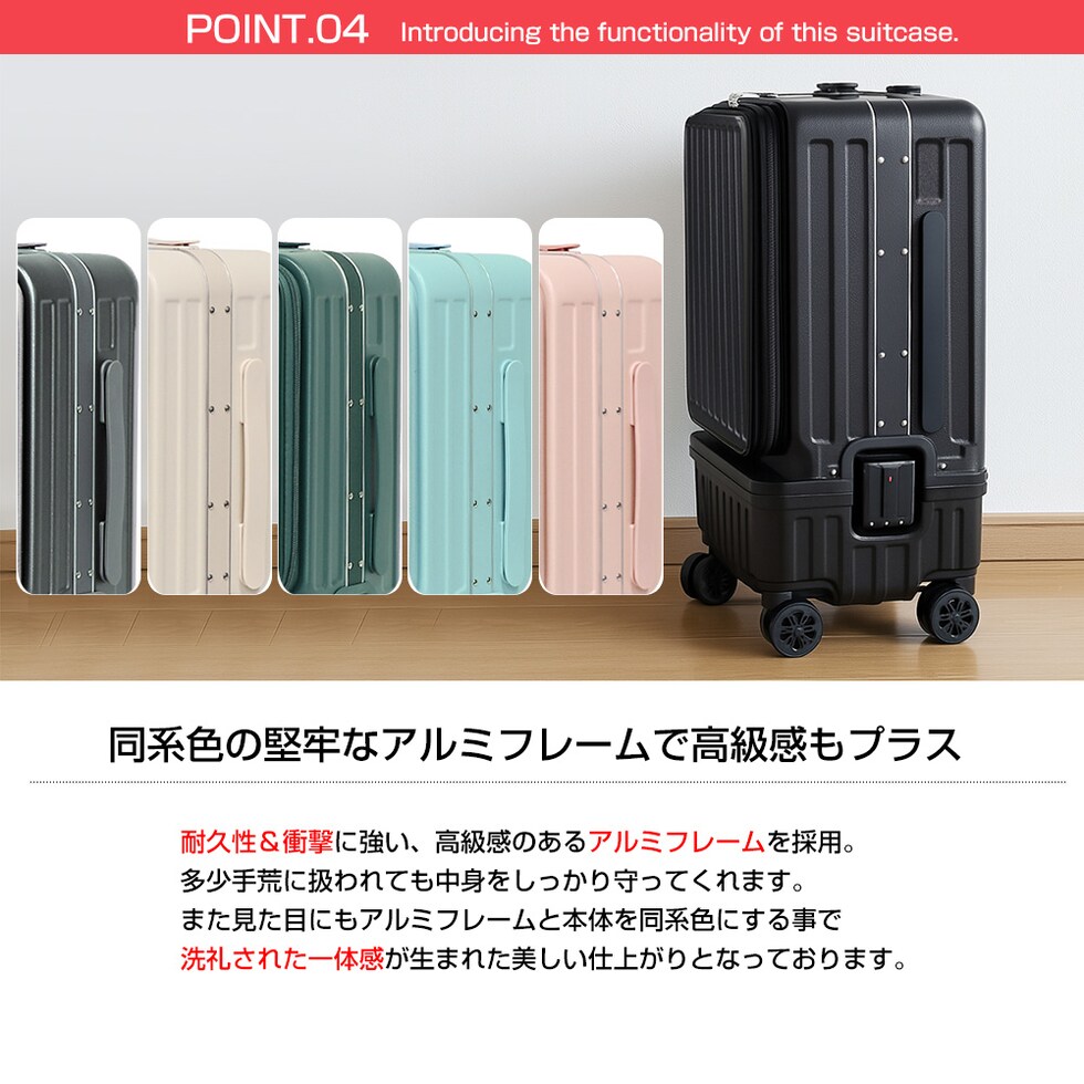 | 『旅をもっと快適に!充実の9つの機能』 【使いやすさ抜群!荷物の出し入れがスムーズなフロントオープン】 使いやすさにもこだわりを。移動先でもスーツケースを立てたまま、ノートPCや書類を簡単に取り出せるよう、スーツケース前面が開くフロントオープン構造を採用。よく使用するノートPCやチケット・化粧ポーチやガジェット類など、すぐに取り出す小物類を前面に。さらにその奥のスペースには、あまり人目に付きたくない、着替えや下着などを収納できるメイン収納部の2重構造となっております。 【USBポート/Type-Cポートを搭載】 モバイルバッテリーをスーツケース内部に接続すれば、スマホやタブレットを充電可能に。スーツケース上部にUSBポートとType-Cポートを備えているので、移動中でもスマートフォンやタブレットの電源切れを心配する事がありません。 (※モバイルバッテリーは付属・内蔵されていません) 【同系色の堅牢なアルミフレームで高級感もプラス】 耐久性&衝撃に強い、高級感のあるアルミフレームを採用。多少手荒に扱われても中身をしっかり守ってくれます。また見た目にもアルミフレームと本体を同系色にする事で洗礼された一体感が生まれた美しい仕上がりとなっております。 【スムーズな移動を実現する360°回転ダブルホイール】 静音性と安定感に優れたダブルホイールを採用。前後・左右・斜め、あらゆる方向にスムーズに動き、混雑した駅や空港でも安定した移動ができます。360度回転仕様で、小回りもラクラク。 【お土産をスマートに持ち運べる便利な隠しフック付】 旅行先でのお土産などを掛けておくのに重宝するのが、側面に取り付けられた便利な隠しフック。紙袋や小さなバッグを掛けて両手を自由にできる優れもの。 【身長やシーンに合わせて使える、3段階調節キャリーバー】 キャリーバーは3段階の高さ調節が可能。身長や持ち運ぶシーンに合わせて、お好みの高さに簡単調整できます。しっかりとしたグリップ感で、操作性も抜群。 ■キャリーバー:地上から最長約93cm/二段目約87cm/一段目約80cm 【キャリーバーの持ち手がスマホスタンドに早変わり!】 電車の待ち時間や空港でのひとときに便利なのが、キャリーバーのスマホスタンド。スマホを置いて動画を見たり、移動先でのオンライン会議をしたり、両手が自由に使えます。 【アメリカ圏に適したTSAロック搭載】 TSAロックとは、アメリカ運輸保安局の認可を受けた特殊な鍵のことです。 アメリカやハワイなど、TSA導入国ではセキュリティ上、預けたスーツケースを空港職員が開錠・検査する場合があります。その際、通常の鍵では壊されてしまうこともありますが、TSAロックであれば、専用のマスターキーで開けることができるため破壊される心配がありません。 ※下段側にある鍵はTSAロックではございません。 『旅のスタイルやファッションに合わせて選べる6色展開』 シンプルで洗練された色合い。あらゆるシーンで活躍してくれる6カラー!あなたはどのカラーを選びますか? |