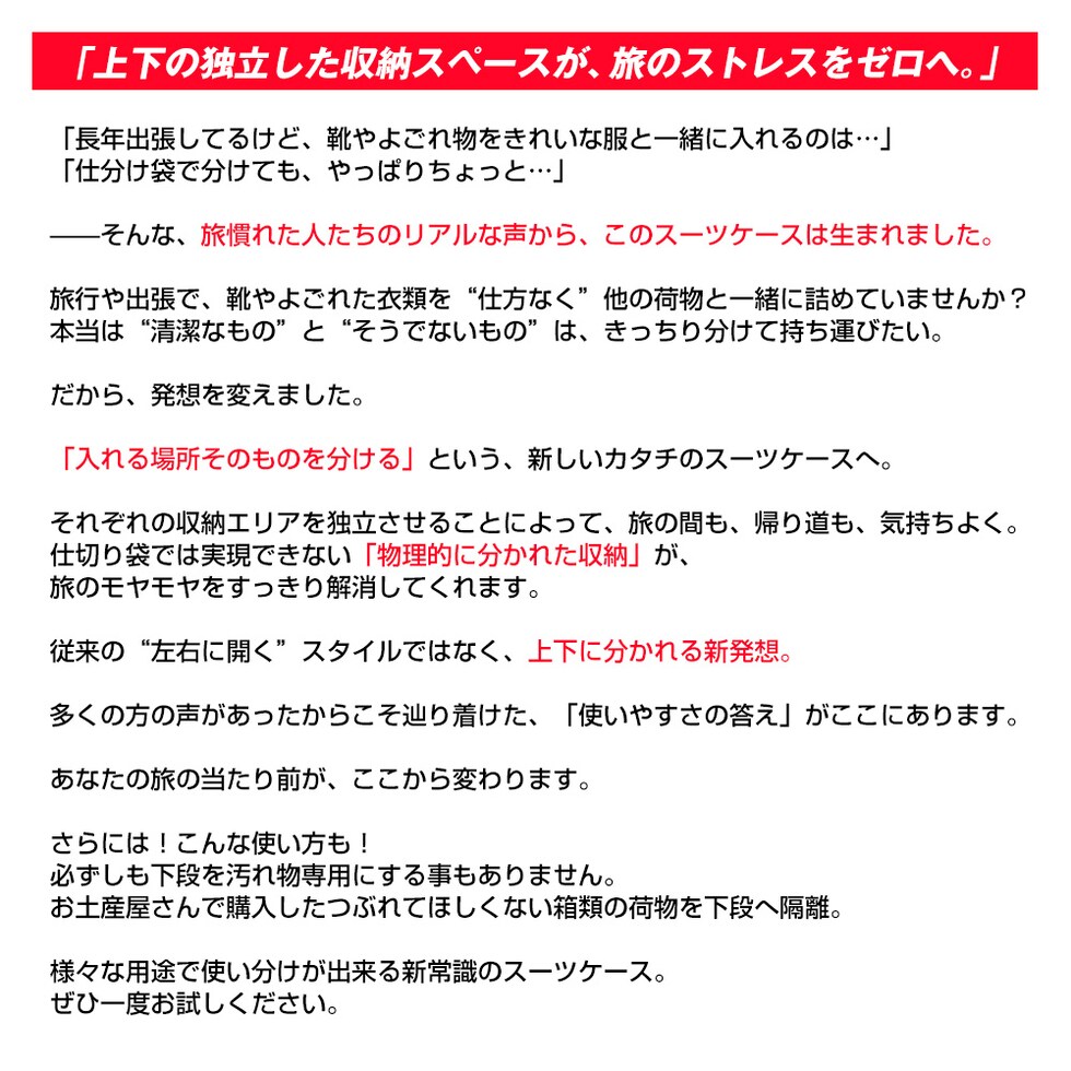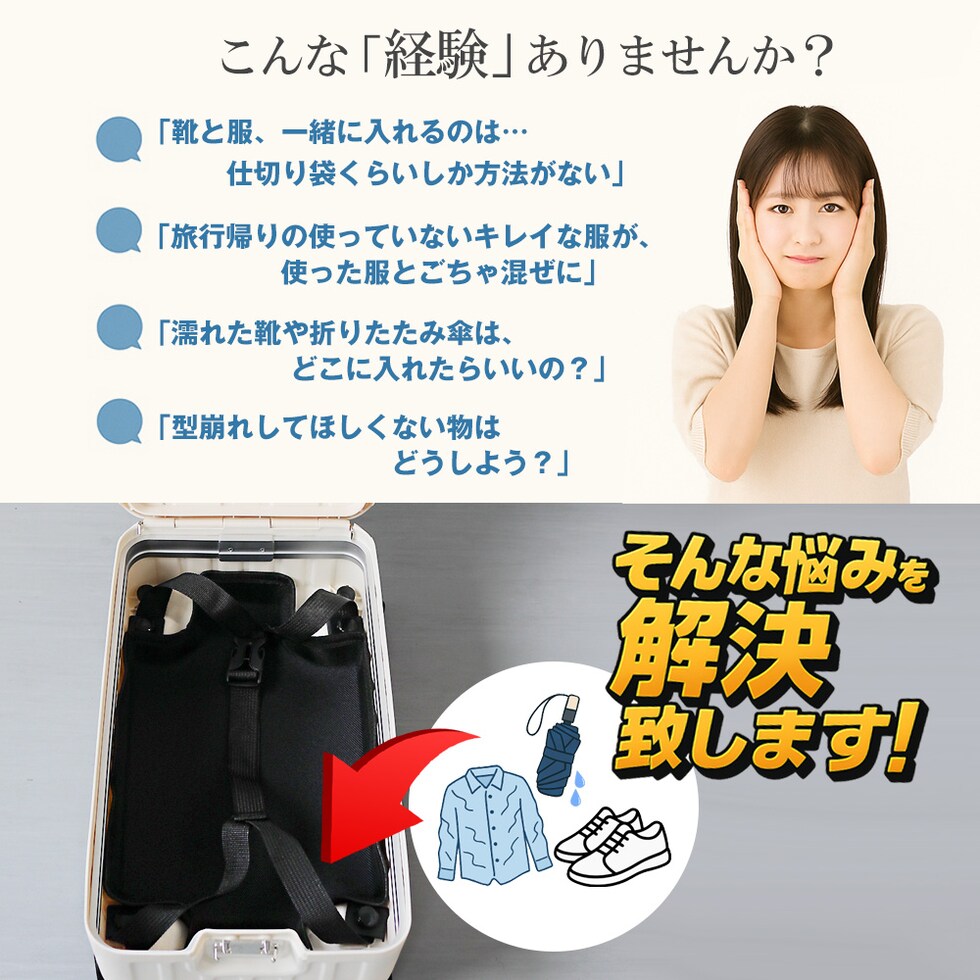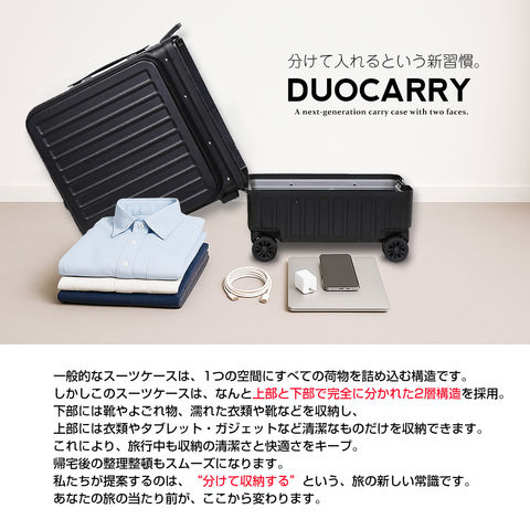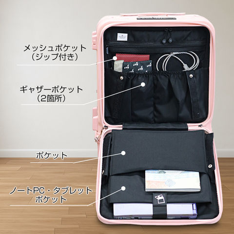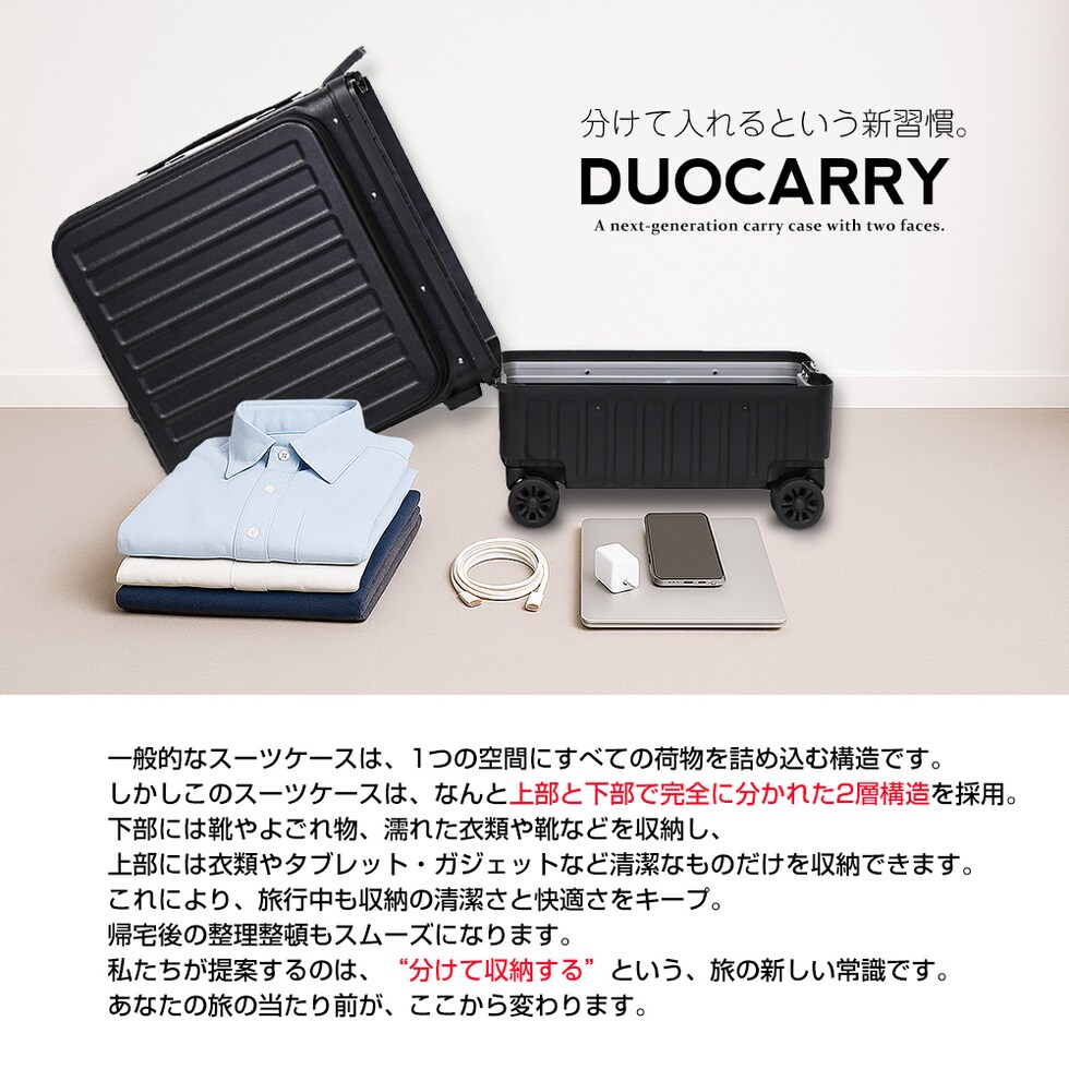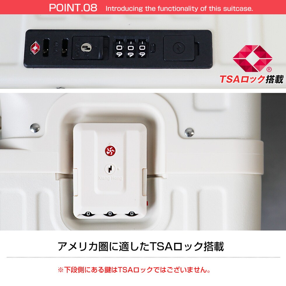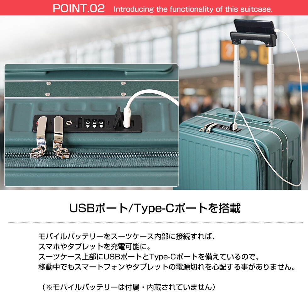| 『旅をもっと快適に!充実の9つの機能』 【使いやすさ抜群!荷物の出し入れがスムーズなフロントオープン】 使いやすさにもこだわりを。移動先でもスーツケースを立てたまま、ノートPCや書類を簡単に取り出せるよう、スーツケース前面が開くフロントオープン構造を採用。よく使用するノートPCやチケット・化粧ポーチやガジェット類など、すぐに取り出す小物類を前面に。さらにその奥のスペースには、あまり人目に付きたくない、着替えや下着などを収納できるメイン収納部の2重構造となっております。 【USBポート/Type-Cポートを搭載】 モバイルバッテリーをスーツケース内部に接続すれば、スマホやタブレットを充電可能に。スーツケース上部にUSBポートとType-Cポートを備えているので、移動中でもスマートフォンやタブレットの電源切れを心配する事がありません。 (※モバイルバッテリーは付属・内蔵されていません) 【同系色の堅牢なアルミフレームで高級感もプラス】 耐久性&衝撃に強い、高級感のあるアルミフレームを採用。多少手荒に扱われても中身をしっかり守ってくれます。また見た目にもアルミフレームと本体を同系色にする事で洗礼された一体感が生まれた美しい仕上がりとなっております。 【スムーズな移動を実現する360°回転ダブルホイール】 静音性と安定感に優れたダブルホイールを採用。前後・左右・斜め、あらゆる方向にスムーズに動き、混雑した駅や空港でも安定した移動ができます。360度回転仕様で、小回りもラクラク。 【お土産をスマートに持ち運べる便利な隠しフック付】 旅行先でのお土産などを掛けておくのに重宝するのが、側面に取り付けられた便利な隠しフック。紙袋や小さなバッグを掛けて両手を自由にできる優れもの。 【身長やシーンに合わせて使える、3段階調節キャリーバー】 キャリーバーは3段階の高さ調節が可能。身長や持ち運ぶシーンに合わせて、お好みの高さに簡単調整できます。しっかりとしたグリップ感で、操作性も抜群。 ■キャリーバー:地上から最長約93cm/二段目約87cm/一段目約80cm 【キャリーバーの持ち手がスマホスタンドに早変わり!】 電車の待ち時間や空港でのひとときに便利なのが、キャリーバーのスマホスタンド。スマホを置いて動画を見たり、移動先でのオンライン会議をしたり、両手が自由に使えます。 【アメリカ圏に適したTSAロック搭載】 TSAロックとは、アメリカ運輸保安局の認可を受けた特殊な鍵のことです。 アメリカやハワイなど、TSA導入国ではセキュリティ上、預けたスーツケースを空港職員が開錠・検査する場合があります。その際、通常の鍵では壊されてしまうこともありますが、TSAロックであれば、専用のマスターキーで開けることができるため破壊される心配がありません。 ※下段側にある鍵はTSAロックではございません。 『旅のスタイルやファッションに合わせて選べる6色展開』 シンプルで洗練された色合い。あらゆるシーンで活躍してくれる6カラー!あなたはどのカラーを選びますか? |
