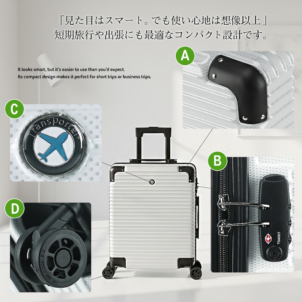 スーツケース 機内持ち込み キャリーケース 軽量 SSサイズ 1泊2日 2泊3日 38L TSAロック 旅行バッグ キャリーバッグ 静音 旅行 ビジネス 出張 修学旅行 海外 国内 ハードケース Transporter 送料無料 【1年保証】【GT18】 オフホワイト トラベルソムリエ t-ss2