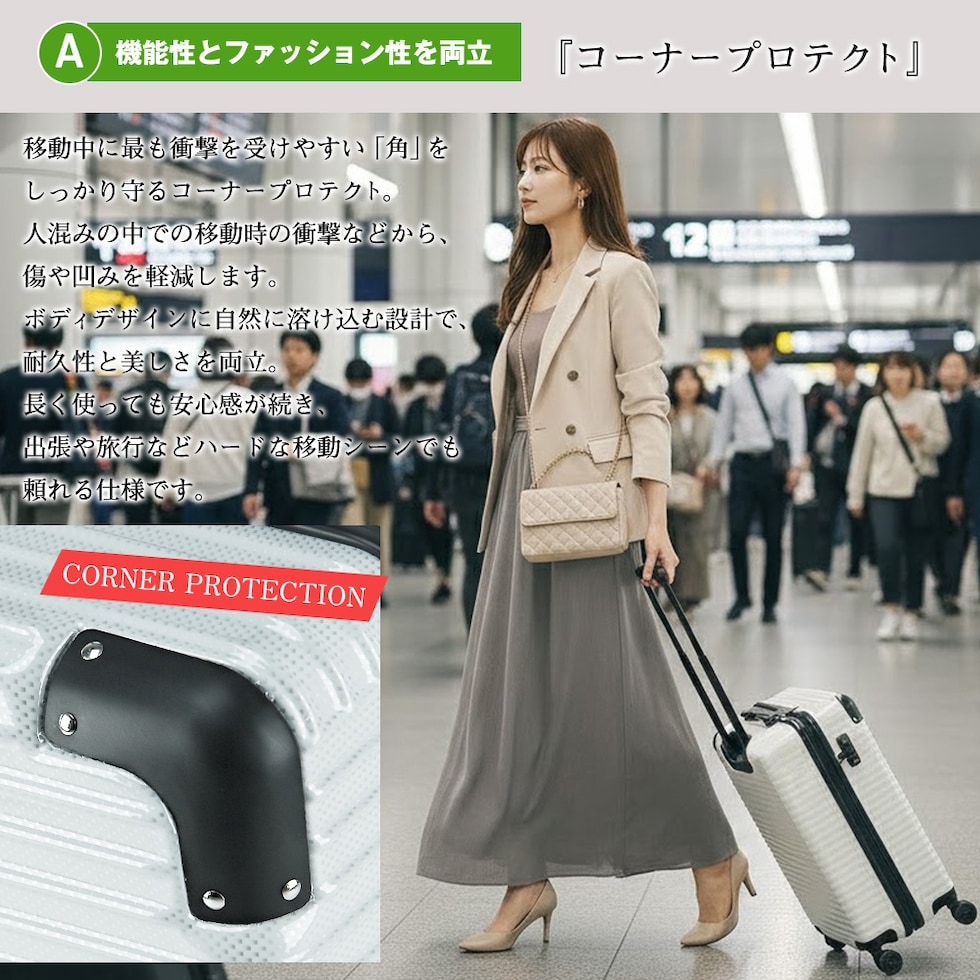 | 衝撃を受けやすい角にコーナープロテクトを配置。移動時の衝突や衝撃からスーツケース本体を守り、長く快適にご使用いただけます。 |