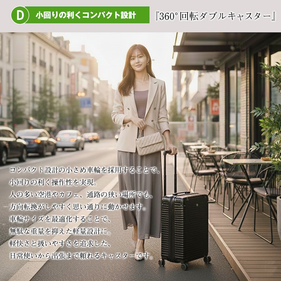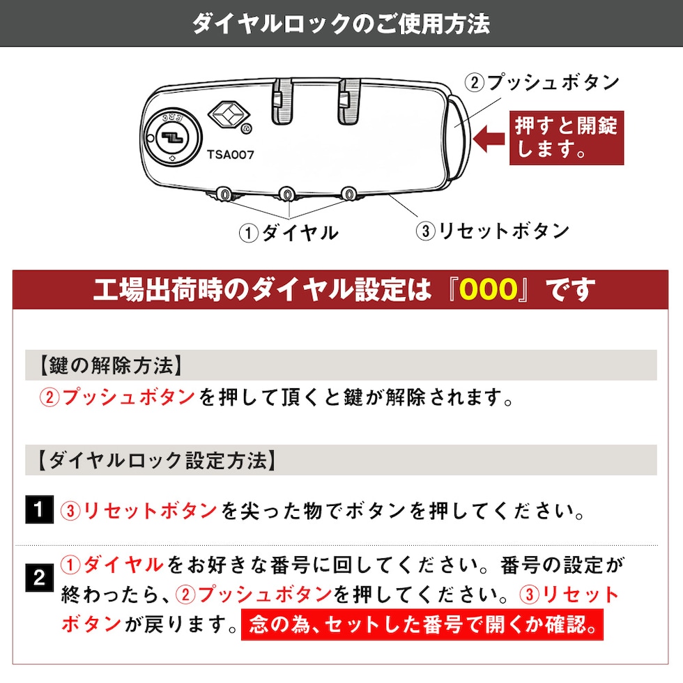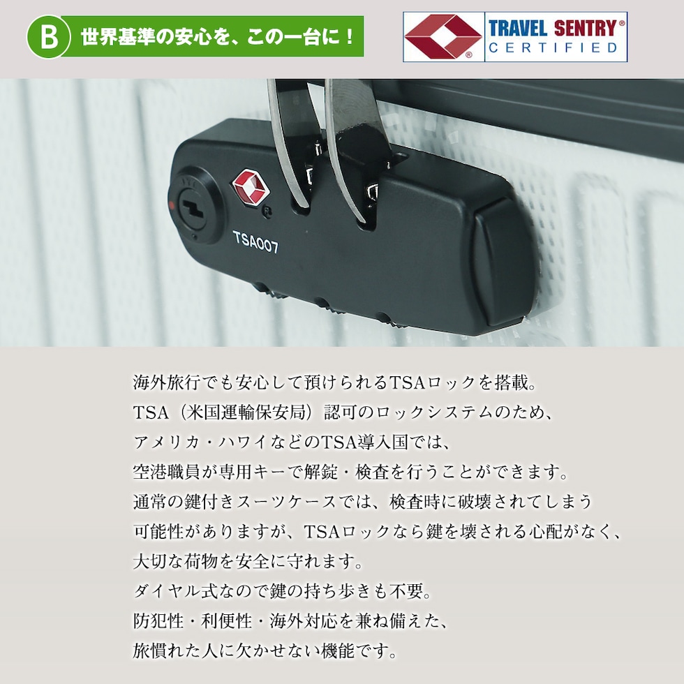 | 海外旅行に対応したTSAロックを装備。空港での検査時もスムーズで、大切な荷物をしっかり守ります。 |