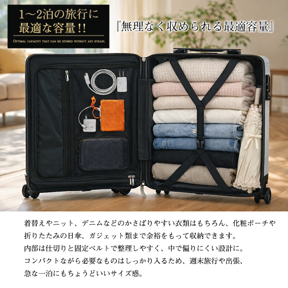 | 航空会社の規定により機内持ち込みが可能なサイズ設計。1~2泊の旅行や出張に最適なキャリーケースです。 ※国際線・国内線(100席以上)の機内に持ち込みに適合したサイズとなっております。 LCC・MCCを除く航空会社で機内持ち込みしていただけます。 また路線、飛行機の種類により機内に持ち込む事が出来ない場合がございますので、予めご了承願います。 |