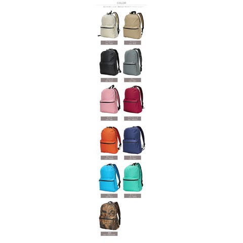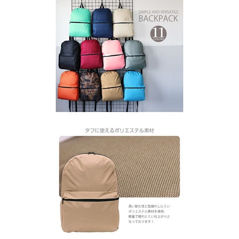 シンプル×大容量! 全11カラーの万能リュック! 《シーンを選ばず使えるシンプルデザイン》 飽きがこない!スッキリとシャープな印象の全11色のシンプルリュック! 普段使いはもちろん、ママリュックとしても○。また旅行や 普段の通勤・通学にも幅広くお使い頂けるデザインになっております。 カジュアルスタイル・上品なきれいめコーデにも自然と馴染む シンプルスタイルのリュックサックは持っていると重宝する事間違いなしの 鉄板アイテムですよ? 《ショルダーストラップは調節が可能》 ショルダーストラップは 自由に長さ調節が出来るので、 お好みに合わせて調節してください。 《物の出し入れがしやすい!大きく開くメイン開口部》 メインコンパートメントは、雑誌やタブレット。 また普段持ち歩いているスマホや サイフ・小物類を入れてもまだまだ余裕のある大容量さ。 さらに前面にジップ付の小物ポケットも付いているので、整理がしやすく 使い勝手の良い仕上がりになっています。 《生活防水仕様で荷物も安心!》 リュックサックの裏側は、裏生地加工を施した生活防水仕様となっています。 日常生活でかかる水滴程度なら耐えられる、うれしい機能となっていますので、 中に収納した荷物も安心! 表面の生地は水分等の染み込みがあるかと思いますが、 ご使用前に防水スプレーを施すと、より安心してお使い頂けるかと思います。 ※完全防水ではございません。またファスナーや縫い目から水が染み込む 恐れがございますので、ご注意ください。 《防災グッズの非常用持ち出し用袋としても》 非常時にすぐに持ち出せる場所に置いておける最適なサイズで、防災用品を収納できる非常用持ち出し袋としても活躍します。 懐中電灯・ラジオ・水・食料・救急セットなどの必需品をしっかり収納可能。 急な災害時にも、さっと背負って安全に避難できます。 選ぶのも楽しい全11色のカラーバリエーション! 使い勝手の良いシンプルリュックは、一つは持っておきたい鉄板アイテム! 通勤通学や普段使いはもちろん、旅行やハイキング・キャンプ・防災の非常用持ち出し袋など様々なシーンで活躍する事間違いなし! |