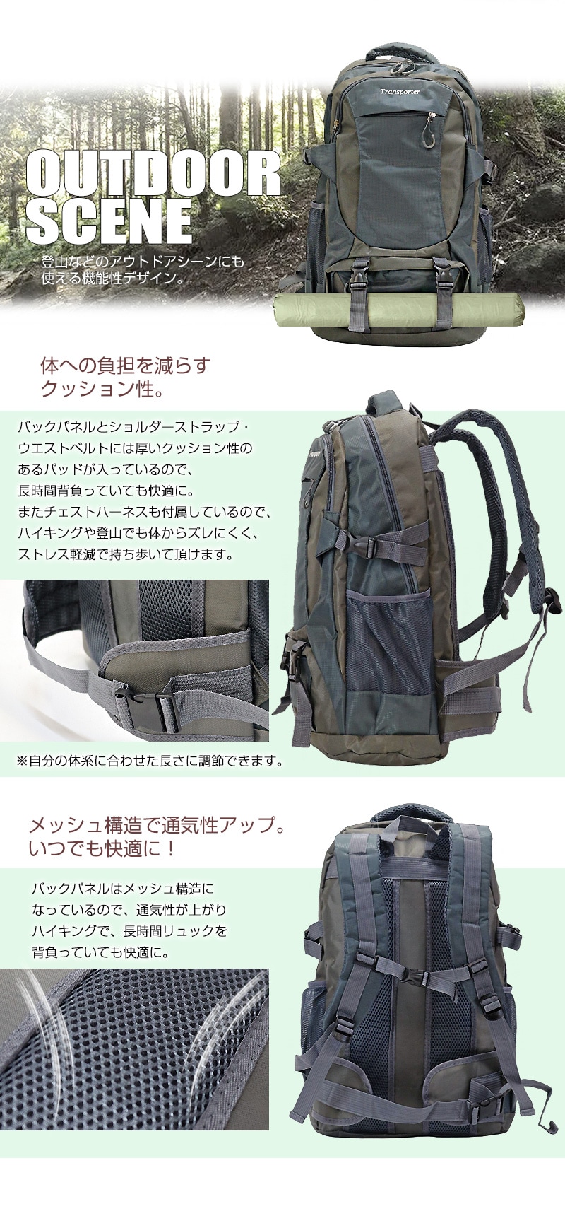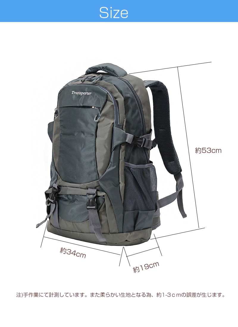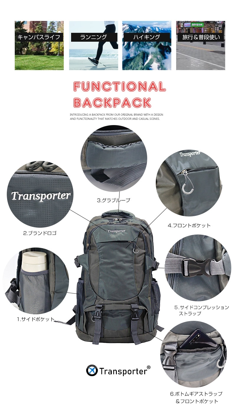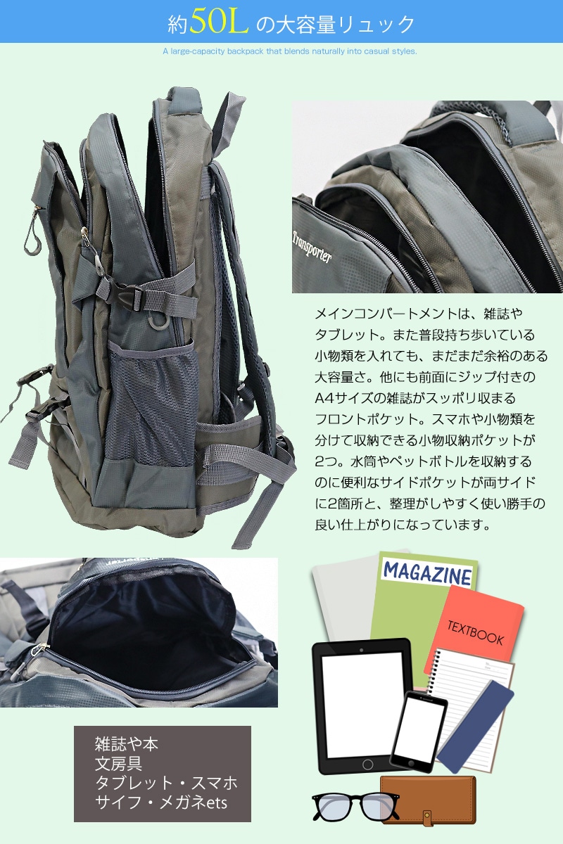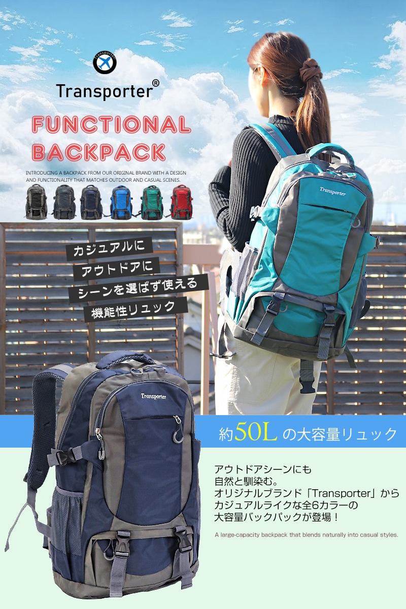 アウトドアシーンにも自然と馴染む。 オリジナルブランド「Transporter」からカジュアルライクな全6カラーの大容量バックパックが登場! 【約50Lの大容量リュック】 メインコンパートメントは、雑誌やタブレット。 また普段持ち歩いている小物類を入れても、まだまだ余裕のある大容量さ。 他にも前面にジップ付きのA4サイズの雑誌がスッポリ収まるフロントポケット。 スマホや小物類を分けて収納できる小物収納ポケットが2つ。 水筒やペットボトルを収納するのに便利なサイドポケットが両サイドに2箇所と、整理がしやすく使い勝手の良い仕上がりになっています。 【体への負担を減らすクッション性】 バックパネルとショルダーストラップ・ウエストベルトには厚いクッション性のあるパッドが入っているので、長時間背負っていても快適に。 またチェストハーネスも付属しているので、ハイキングや登山でも体からズレにくく、ストレス軽減で持ち歩いて頂けます。 【メッシュ構造で通気性アップ。いつでも快適に!】 バックパネルはメッシュ構造になっているので、通気性が上がりハイキングで、長時間リュックを背負っていても快適に。 【防災グッズの非常用持ち出し用袋としても】 非常時にすぐに持ち出せる場所に置いておける最適なサイズで、防災用品を収納できる非常用持ち出し袋としても活躍します。 大容量かつ整理しやすいポケット構造により、懐中電灯・ラジオ・水・食料・救急セットなどの必需品をしっかり収納可能。 急な災害時にも、さっと背負って安全に避難できます。 キャンパスライフ・ランニング・ハイキング・旅行や普段使い・防災の非常用持ち出し袋など、マルチに活躍してくれる「Transporter」機能性リュック! 重宝する事、間違いなしの鉄板アイテムです! |