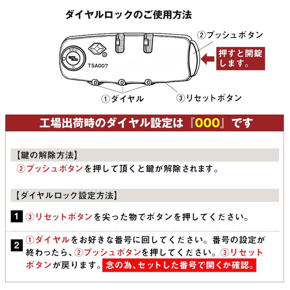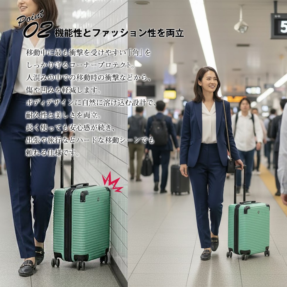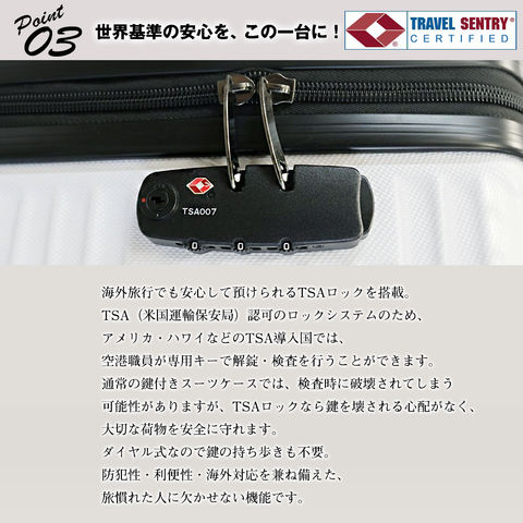 | ボディの素材は堅牢なABSを使用。またコーナープロテクトは、アルミニウム合金仕様で耐衝撃性に優れ、旅行中の荷物をしっかりガード。TSAロック(搭載モデル)なら、海外旅行でも荷物チェックがスムーズです。 |