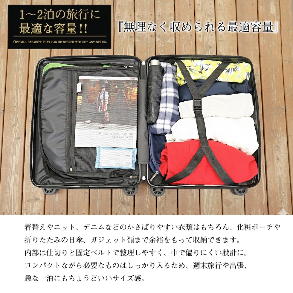 | 1~3泊の国内・海外旅行・出張に最適なSSサイズ スーツケース。コンパクトながら約28Lの大容量収納で、荷物が多い方でも安心して収納可能です。 |