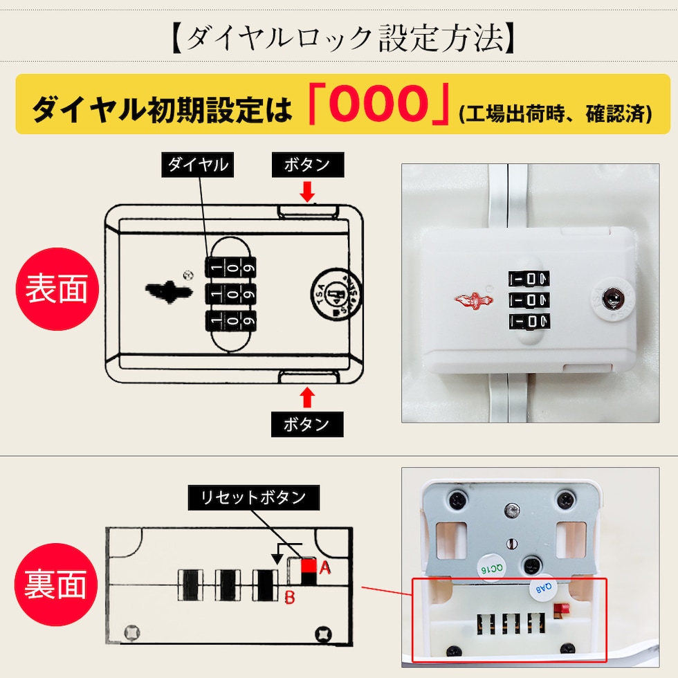 【ダイヤルロック設定方法】 1.裏面のリセットボタンをAからBへ移動させてください。 2.ダイヤルを回して頂き、お好きな番号へ設定してください。 3.番号が決まりましたら、再度裏面のリセットボタンをBからAに移動させて完了です。 スーツケースを開ける際は、表面のボタン2箇所を同時に押して頂くと、ダイヤルロックが開錠致します。 ※ご注意 番号設定する場合はダイヤルを回す際に、手が滑らないよう十分にお気を付けください。 |