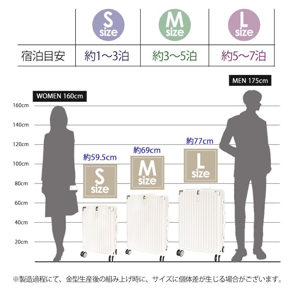 | ケースサイズ | 【Sサイズ】約H50×W35×D23cm 【Mサイズ】約H60.5×W41×D26.5cm 【Lサイズ】約H70.5×W48×D30.5cm |