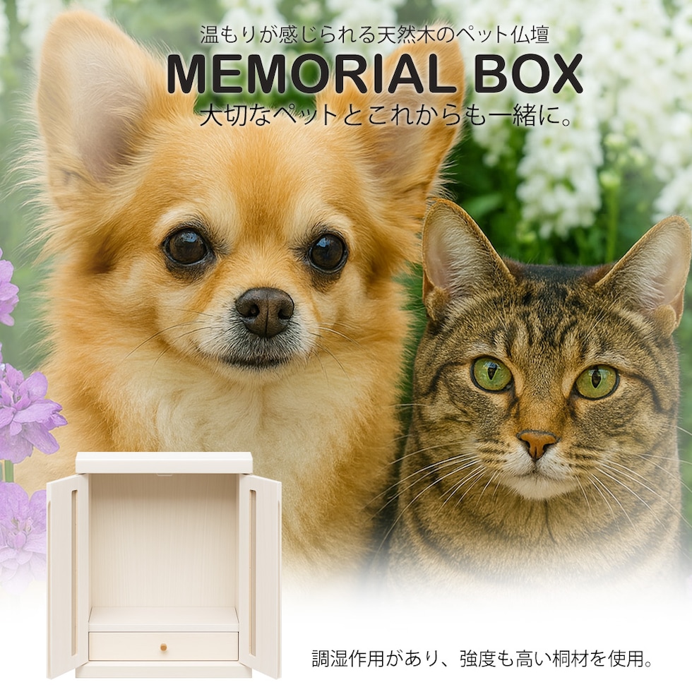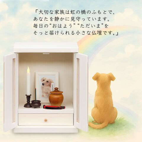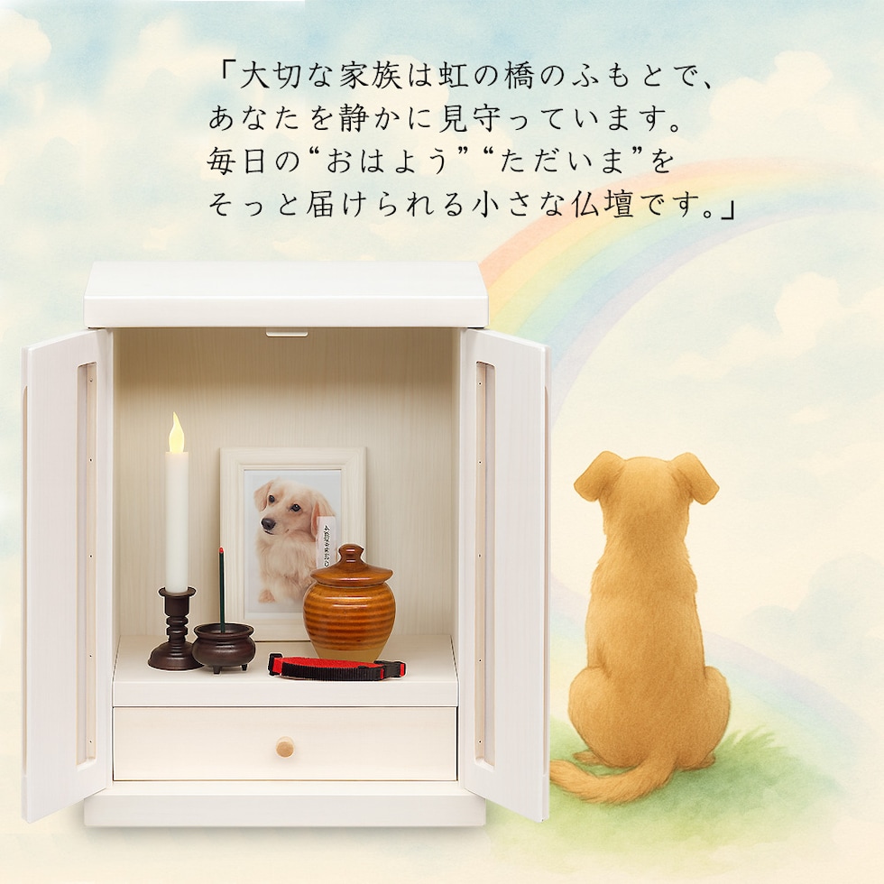 大切な家族を、そっと身近に感じられる。 このペット仏壇は、温もりが感じられる天然木(桐材)を使用した国産品です。 やさしい木目と落ち着いた風合いは、リビングや寝室など他の家具と自然に馴染むデザイン。 お部屋の雰囲気を壊さず、大切なペットとの暮らしをそっと支えます。 桐材は湿度調整に優れ、軽くて扱いやすいのが特徴。 大切な思い出の写真やお気に入りの小物を安心して飾ることができます。 「いつもそばにいてほしい」という想いに寄り添い、 ペットと“いつも一緒”に過ごせる心安らぐ空間を作ります。 国産の丁寧な仕上げで長く使えるペット仏壇をお探しの方、 インテリアに溶け込むシンプルな天然木デザインを求める方におすすめです。 【ご注意】 ■火災の原因になりますので、火を使用するローソク・線香のご使用は絶対にしないでください。 ■電子ローソクやLEDローソクは、使用上の注意を守ってご使用ください。 ■火災に関して一切の責任は負いませんので、予めご了承ください。 | |