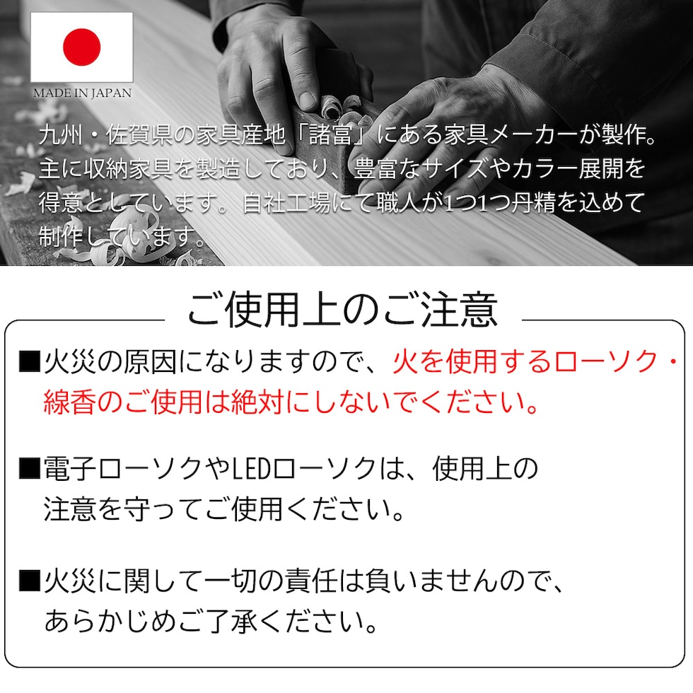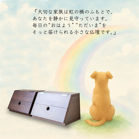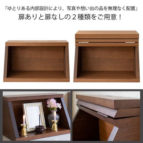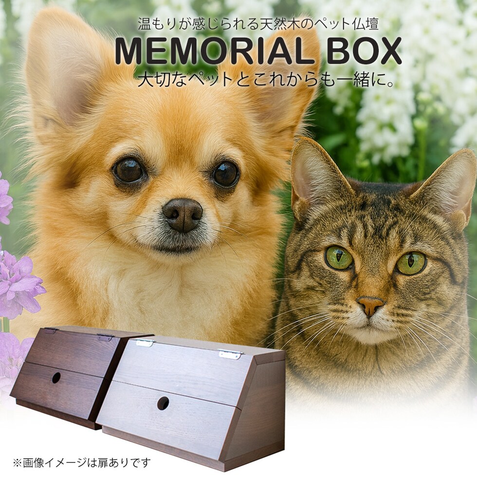 大切な家族であるペットの供養に。 家具になじむホワイトオーク材を使用した 小型ペット仏壇(扉あり・扉なしの2タイプ) です。 自然な木目が美しいホワイトオーク材は、リビングや寝室にも置きやすく、 ペット仏壇・ペット供養台・ミニ仏壇・メモリアルボックス をお探しの方に最適。 省スペース設計なので、小型犬・猫・うさぎ・ハムスター などあらゆる家族の供養にお使いいただけます。 扉付きタイプはホコリを防ぎ、扉なしタイプはいつでも優しく見守れる開放的なデザイン。 写真立てや骨壺、遺品、LEDローソクなどもすっきり飾れるため、 「おしゃれなペット供養をしたい」 という方に選ばれています。 【ご注意】 ■火災の原因になりますので、火を使用するローソク・線香のご使用は絶対にしないでください。 ■電子ローソクやLEDローソクは、使用上の注意を守ってご使用ください。 ■火災に関して一切の責任は負いませんので、予めご了承ください。 | |