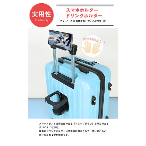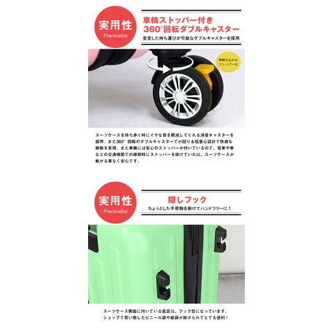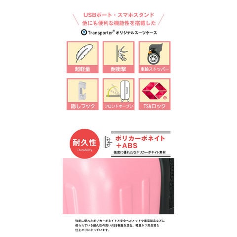 進化し続けるモノつくり 旅を楽しむ方のニーズにお答えしたスーツケースが誕生。 スタイリッシュな雰囲気と長く愛用して頂ける機能性を兼ね備えた「旅カジ」シリーズから新作スーツケースが登場! 【強度に優れたなポリカーボネイト素材】 強度に優れたポリカーボネイトと安全ヘルメットや家電製品などに使われている耐久性の高いABS樹脂を混合。軽量かつ高品質な仕上がりになっています。 【USBポート&TSAロック】 国際基準のTSAロック搭載で海外旅行も安心! アメリカ領土への渡航時、手荷物または預け入れ荷物は、一切施錠しないのが原則となっております。 施錠された荷物についてはTSA係官が錠機構を破壊することが認められており、破壊されたり盗難があったりしても補償は一切ないのが現状となっております。 そこで便利な機能がTSAロック機能。このロック機能を使用すれば荷物を施錠して航空会社に預け入れしていただけます。 万が一、荷物の検査が必要になった場合は、職員が専用のスペシャルツールで解錠・検査しますので、錠機構を破壊されることがありません。 荷物を施錠せずに渡すというリスクを負うことなく、安心して海外に出ることができる便利なロック機能がTSAロックとなっております。 ※鍵穴はありますが、鍵は付属していません。 旅先での充電切れを解消!快適な旅行をサポート!してくれる便利な「USBポート」 Type-Cポートも搭載しているので、16シリーズやBluetoothイヤホンにも対応してくれます。 【車輪ストッパー付き&360°回転ダブルキャスター】 スーツケースを持ち歩く時にイヤな音を軽減してくれる消音キャスターを 採用。また360°回転のダブルキャスターで小回り&低重心設計で快適な 移動を実現。また車輪には安心のストッパーが付いているので、電車や車 などの交通機関での移動時にストッパーを掛けていれば、スーツケースが 転がる事なく安心です。 【ちょっとした手荷物を掛けておける隠しフック】 スーツケース側面に付いている底足は、フック型になっています。 ショップで買い物したビニール袋や紙袋が掛けられてとても便利! 【フロントオープンタイプ】 両脇のマジックテープを外すと90度開くので荷物の出し入れが楽! よく使用するタブレットなどもこのフロントポケットに収納しておくと、すぐに取り出せて便利です。 【フロント部にはタブレット!メイン収納部は着替えを!】 スーツケースを開け閉めする時に荷物がこぼれるという事故を防ぐ為、片側は ファスナー仕切りを採用。人前でスーツケースを開けてもファスナー内の荷物は 見えないよう考慮したデザインになっております。またもう片方は荷崩れを防ぐ クロスベルト付き。簡単装着ベルトでたっぷり荷物を詰め込んで頂けます。 |