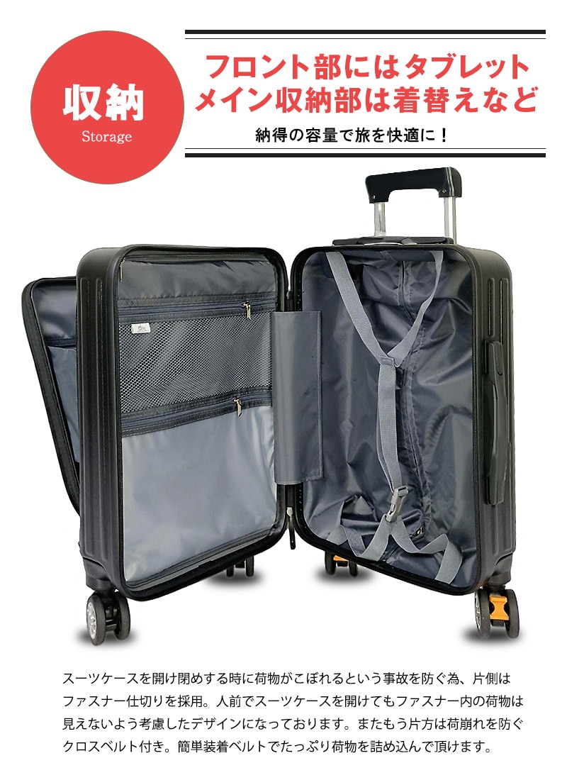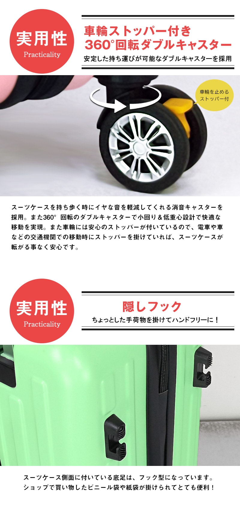 進化し続けるモノつくり 旅を楽しむ方のニーズにお答えしたスーツケースが誕生。 スタイリッシュな雰囲気と長く愛用して頂ける機能性を兼ね備えた「旅カジ」シリーズから新作スーツケースが登場! 【強度に優れたなポリカーボネイト素材】 強度に優れたポリカーボネイトと安全ヘルメットや家電製品などに使われている耐久性の高いABS樹脂を混合。軽量かつ高品質な仕上がりになっています。 【USBポート&TSAロック】 国際基準のTSAロック搭載で海外旅行も安心! アメリカ領土への渡航時、手荷物または預け入れ荷物は、一切施錠しないのが原則となっております。 施錠された荷物についてはTSA係官が錠機構を破壊することが認められており、破壊されたり盗難があったりしても補償は一切ないのが現状となっております。 そこで便利な機能がTSAロック機能。このロック機能を使用すれば荷物を施錠して航空会社に預け入れしていただけます。 万が一、荷物の検査が必要になった場合は、職員が専用のスペシャルツールで解錠・検査しますので、錠機構を破壊されることがありません。 荷物を施錠せずに渡すというリスクを負うことなく、安心して海外に出ることができる便利なロック機能がTSAロックとなっております。 ※鍵穴はありますが、鍵は付属していません。 旅先での充電切れを解消!快適な旅行をサポート!してくれる便利な「USBポート」 Type-Cポートも搭載しているので、16シリーズやBluetoothイヤホンにも対応してくれます。 【車輪ストッパー付き&360°回転ダブルキャスター】 スーツケースを持ち歩く時にイヤな音を軽減してくれる消音キャスターを 採用。また360°回転のダブルキャスターで小回り&低重心設計で快適な 移動を実現。また車輪には安心のストッパーが付いているので、電車や車 などの交通機関での移動時にストッパーを掛けていれば、スーツケースが 転がる事なく安心です。 【ちょっとした手荷物を掛けておける隠しフック】 スーツケース側面に付いている底足は、フック型になっています。 ショップで買い物したビニール袋や紙袋が掛けられてとても便利! 【フロントオープンタイプ】 両脇のマジックテープを外すと90度開くので荷物の出し入れが楽! よく使用するタブレットなどもこのフロントポケットに収納しておくと、すぐに取り出せて便利です。 【フロント部にはタブレット!メイン収納部は着替えを!】 スーツケースを開け閉めする時に荷物がこぼれるという事故を防ぐ為、片側は ファスナー仕切りを採用。人前でスーツケースを開けてもファスナー内の荷物は 見えないよう考慮したデザインになっております。またもう片方は荷崩れを防ぐ クロスベルト付き。簡単装着ベルトでたっぷり荷物を詰め込んで頂けます。 |