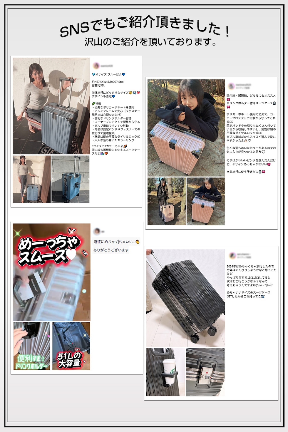 都会的でお洒落にカッコよく。実用性のある機能性も忘れない。 ビジネス/プライベート。スタイルを選ばず使える! 全7カラーの「Transporter」オリジナルスーツケース。 ●実用性のある機能的デザイン 【ダブルキャスター】 スーツケースを倒さずに移動でき、キレイにまとめた荷物の片寄りを軽減する水平移動が可能。 ホイールは360°回転してくれるので、人混みの中でもスムースな動きで快適な旅が楽しめます。 さらに消音キャスターを採用しているので、ストレスフリーで持ち歩いて頂けます。 【アルミフレーム】 スマートでカッコいい。デザイン性も兼ね備えたアルミフレームは、耐久性に優れていて丈夫! ボディ素材は、ABS+ポリカーボネイトで丈夫さも兼ね備えた軽量ボディに仕上がりました。 【大容量の内装】 スーツケースを開け閉めする時に荷物がこぼれるという事故を防ぐ為、片側はファスナー仕切りを採用。 人前でスーツケースを開けてもファスナー内の荷物は見えないよう考慮したデザインになっております。 またもう片方は荷崩れを防ぐクロスベルト付き。簡単装着ベルトでたっぷり荷物を詰め込んで頂けます。 【カップホルダー】 ペットボトルや水筒を手で持ち歩るくストレスを無くしてくれるのが、便利なカップホルダー。 使用後の濡れた折りたたみ傘を置いておくのにも便利ですよ。使わない時は畳んでおける便利機能! 【コーナープロテクト】 落ち着いたブラックカラーのコーナープロテクトは、全体を引き締める効果もあり、強度を上げる重要な役割を果たしてくれます。 また持ち手も丈夫な素材を使用していますので、劣化がしにくく長く愛用して頂けます。 【キャリーバー】 スーツケースで多用する部分だからこそ拘りを。 親指でプッシュするだけの、簡単操作で簡単にキャリーバーを引出す事が出来るので、片手がふさがった状態でもストレスなくお使い頂けます。 また交通機関をご利用するなどシーンに合わせて多段階調節が出来るのもうれしいですね。 【ダイヤルロック】 スマートでカッコいい。デザイン性も兼ね備えたアルミフレームは、耐久性に優れていて丈夫! またセキュリティ面も3桁のダイヤルロックでしっかりガード。大切なお荷物を守ります。 |