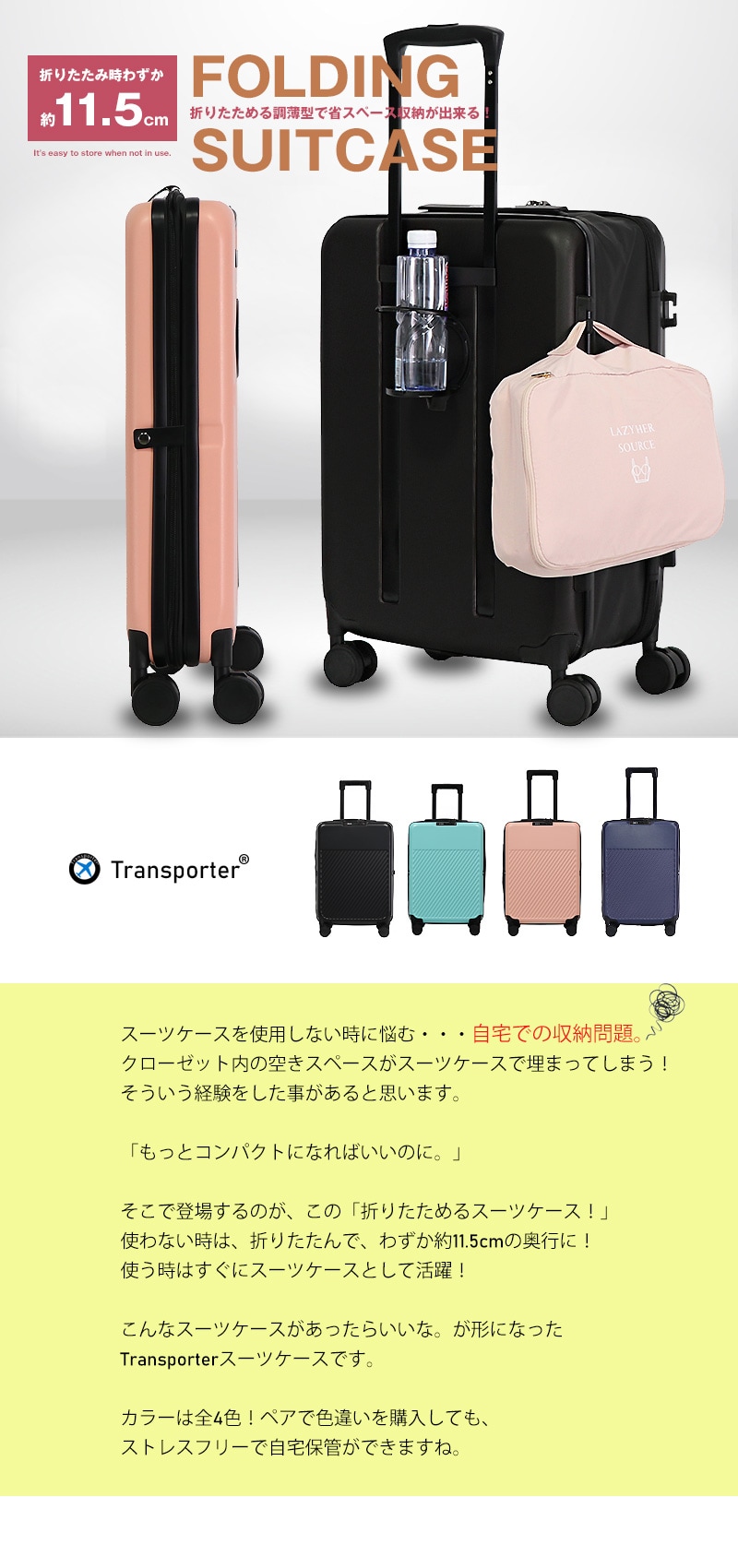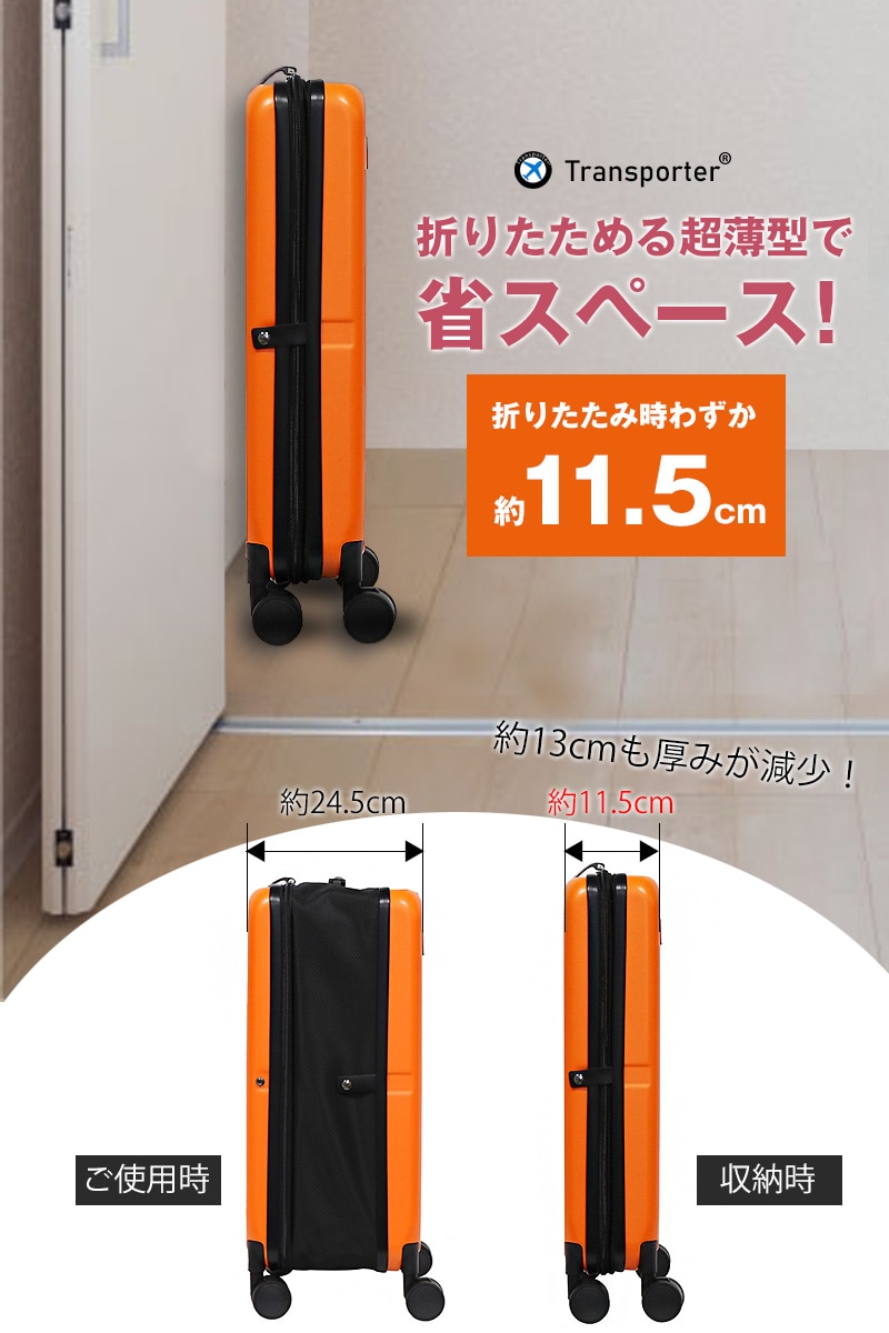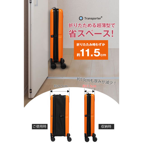 スーツケースを使用しない時に悩む・・・自宅での収納問題。 クローゼット内の空きスペースがスーツケースで埋まってしまう! そういう経験をした事があると思います。 「もっとコンパクトになればいいのに。」 そこで登場するのが、この「折りたためるスーツケース!」 使わない時は、折りたたんで、わずか約11.5cmの奥行に! 使う時はすぐにスーツケースとして活躍! こんなスーツケースがあったらいいな。が形になった Transporterスーツケースです。 カラーは全4色!ペアで色違いを購入しても、 ストレスフリーで自宅保管ができますね。 |