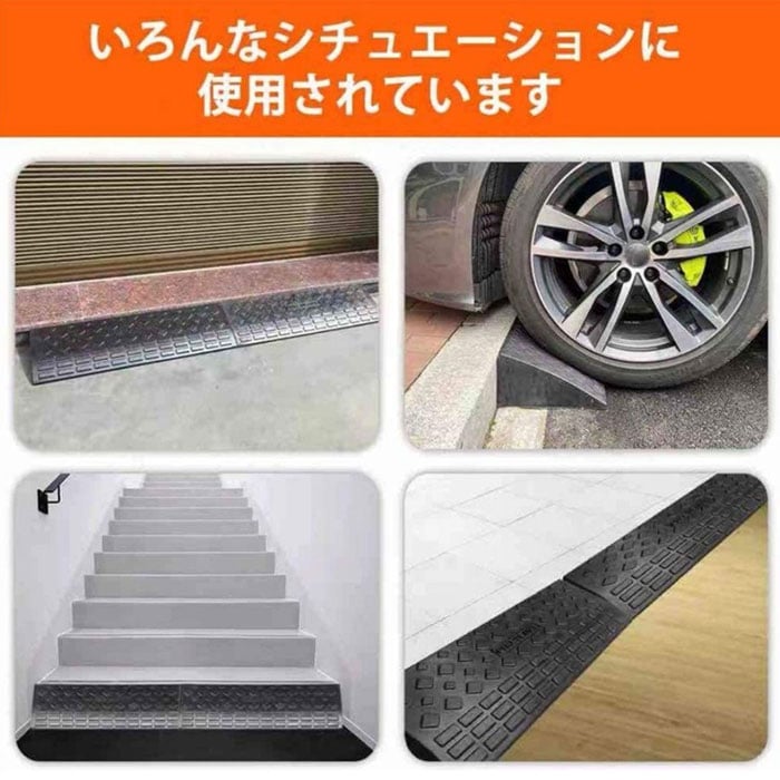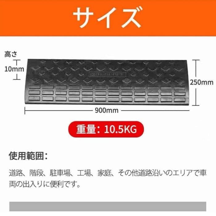 【商品詳細】 サイズ:幅約90cm×奥行き約25cm 適合段差:約10cm 材質:ゴム製 本体重:約10.5kg 耐荷重:中型トラックまで ・「横連結用のボルト付き」 車庫などの幅に合わせて長めに設置したい場合、連結タイプもおすすめです。 ネジや専用のボルトで、複数個を横につなぎ合わせることができ、1つ1つ並べるよりも、ズレにくく安定感が増します。 ・ゴム製の段差プレートは、衝撃を吸収しやすく、通過時の音も小さいことが特徴です。 静かな住宅地に設置する場合や、通行回数が多い場合、夜間や早朝など、周りが静かな時間帯に通行することがある場合にもおすすめです。 ・水が抜けやすい底面形状、表面滑りにくいように工夫されている商品もあります。 タイヤのスリップを防ぐための表面加工が施されているものや、滑り止め用の突起や凹凸が連続して付いているタイプなら、雨など悪天候の日でも安心です。 ・段差プレートは、段差がある場所に設置し、スロープ状にできるアイテムです。 段差解消ブロックや、段差ステップと呼ばれることもあります。 駐車場やガレージ、玄関前など様々な場所に使われ、車や自転車、ベビーカー、台車などの移動をスムーズにできます ※単品、4個、8個セットも販売しております。 | |