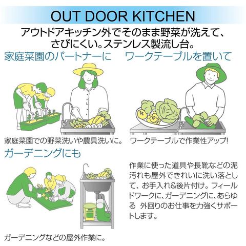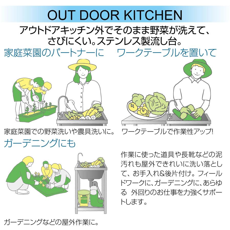 【様々な場所に設置可能】 庭先やベランダ、畑、工場など活躍の場は様々。お庭でのガーデニングやBBQなどでも大活躍する流し台です。