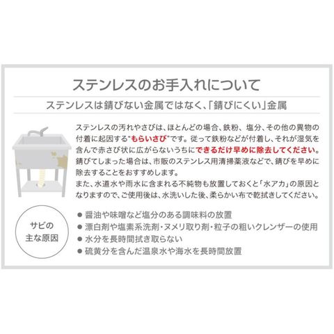 ※シンクでの作業終了時には水分や汚れをよく拭き取ってください。清潔な状態を保つことにより、さらにサビの発生を予防することができます。