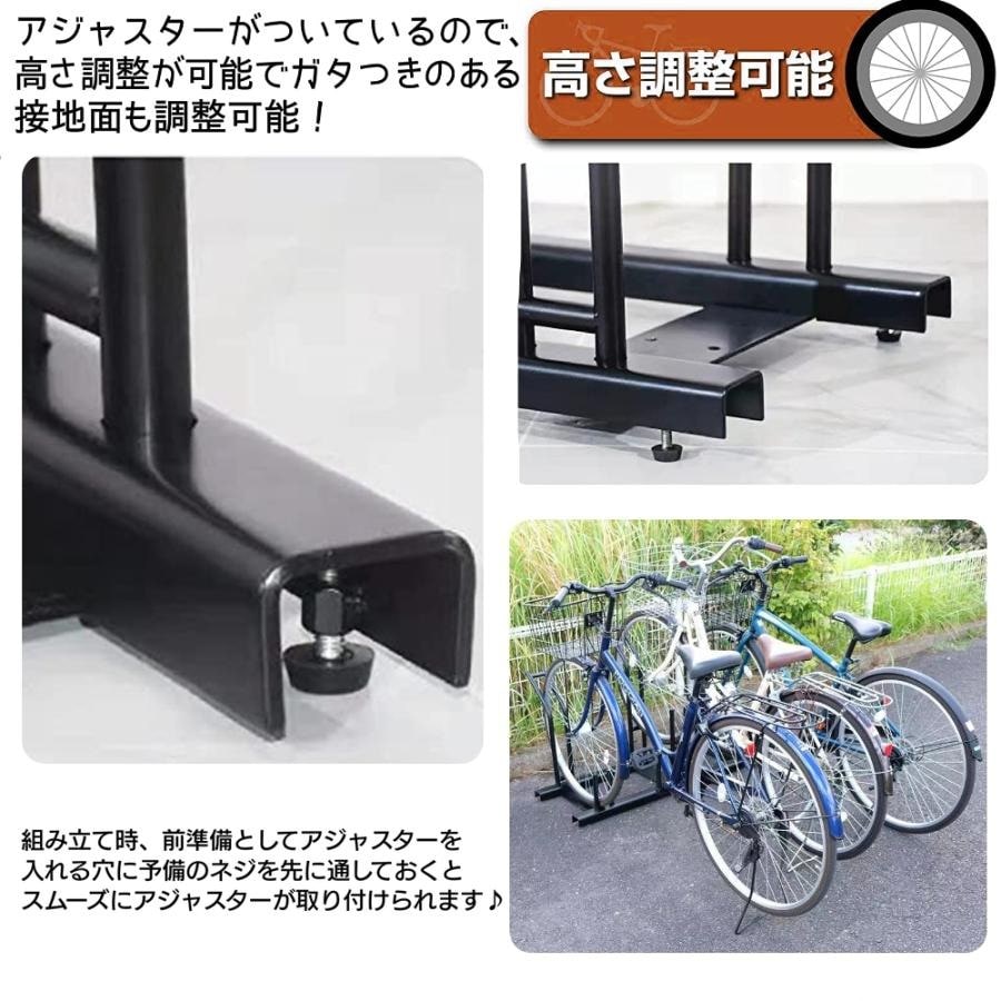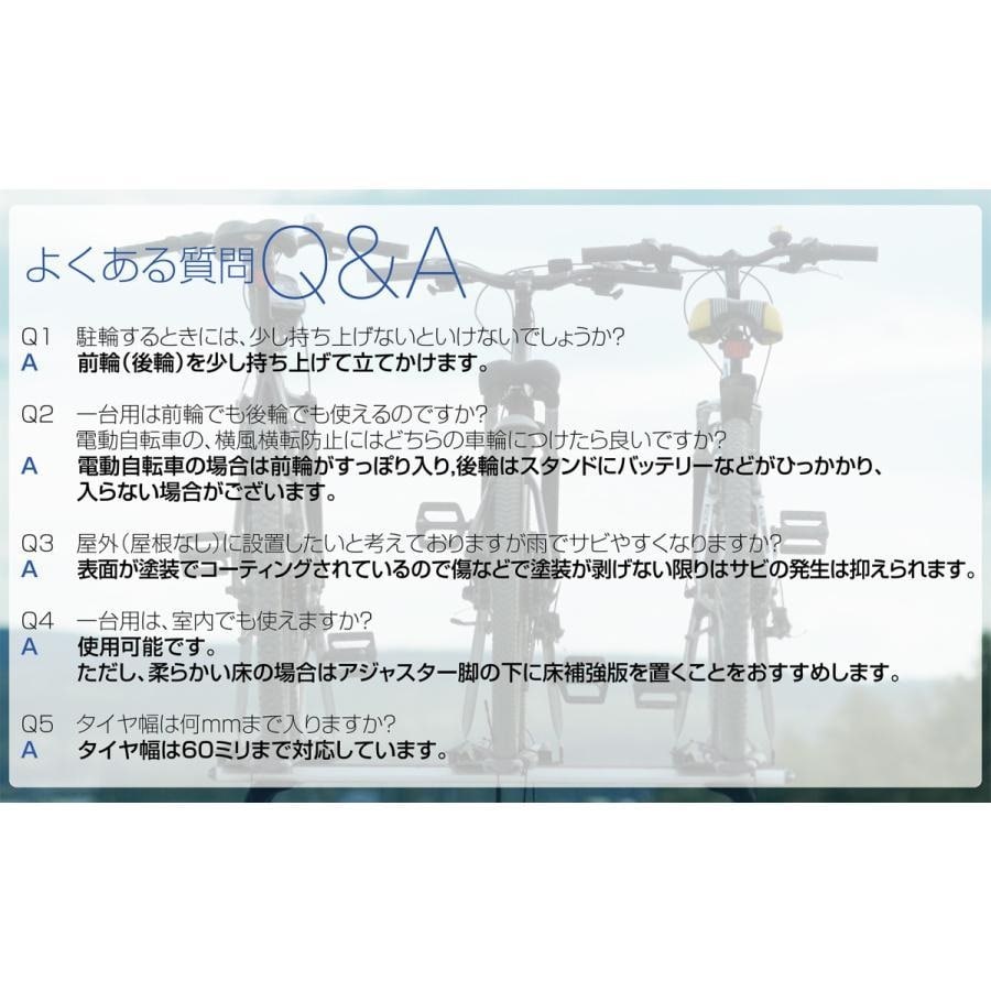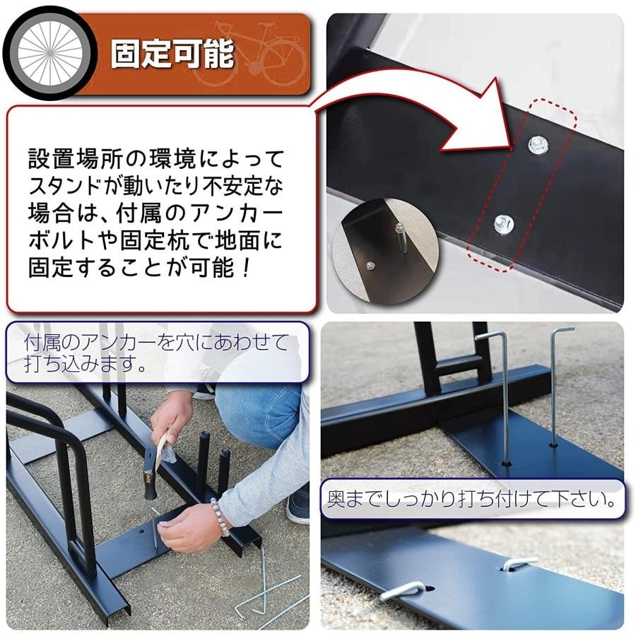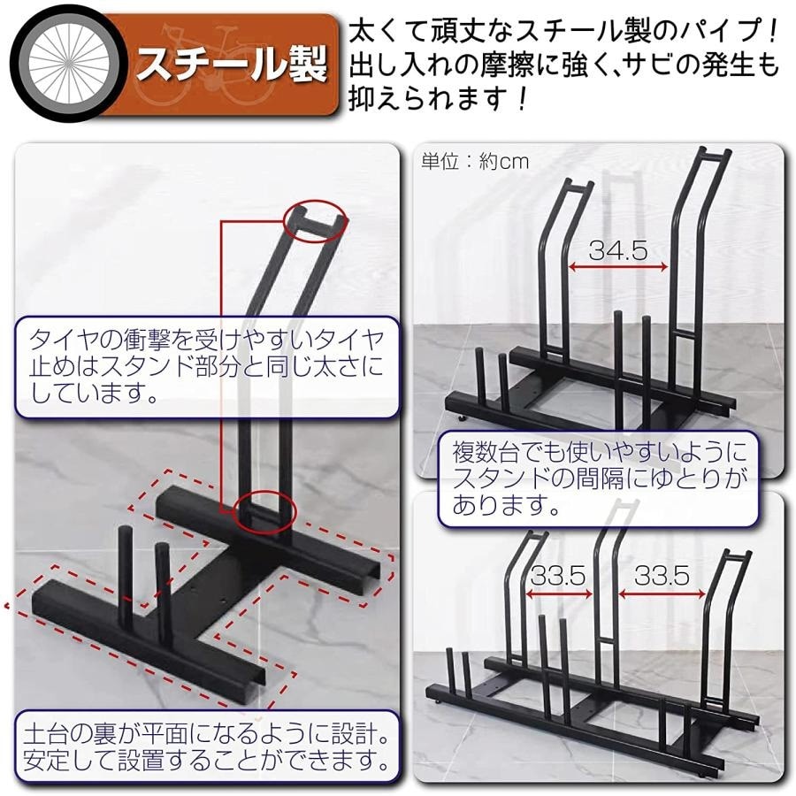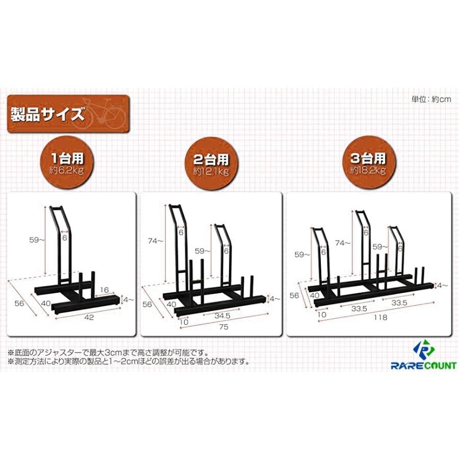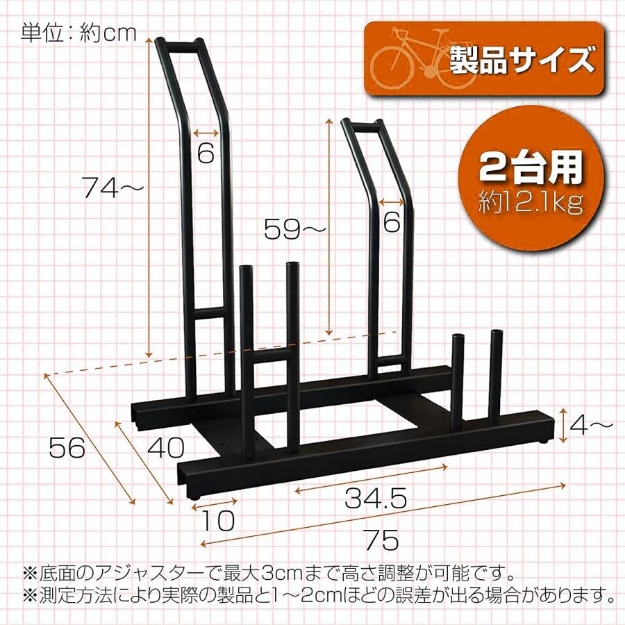 横風にも強い自転車スタンド。 シンプルなデザインで景観を損なわず自転車を整理できます。 ご自宅だけでなく、ガレージ、店舗や展示会などの駐車場にもおすすめです。 幅広いタイプの自転車に対応!タイヤ幅が約6cm以内であれば、子供用の自転車からマウンテンバイクまで幅広い自転車に対応が可能です。 【自転車の整理整頓に最適】 無造作に自転車をとめてしまうと、前輪があちこちに傾いてバランスを崩したり、倒れたり、一台ごとの駐輪スペースの場所をとってしまうことがあります。自転車スタンドの使用によりこのような状況を防ぎます。 【アジャスターで高さ調整】 付属しているアジャスターを使用し、設置の際のガタつきの微調整をすることができます。アジャスター不使用の場合は地面に接する部分が平らになるので、面でしっかり支えます。 【シンプルなデザイン】 ご自宅だけでなく、ガレージ、店舗や展示会などの駐車場にもおすすめです。頑丈なスチール製なので倒れにくく、塗装もしっかりとされているため自転車スタンド本体のサビの発生を防ぎます。 【アンカーボルト&固定杭付き】 固定用の穴をあらかじめ開けているので、砂地やコンクリートでも4か所でしっかりと固定できます。簡単には動かないので盗難防止の対策もとることができます。 ※一つひとつ製造しているためサイズや重量は多少の誤差があります。 ※組み立てる際は怪我をしないよう、付属の軍手を着用して十分に気を付けて組み立ててください。 ※商品に不具合や不明な点があれば気軽にご連絡してください。 ※製造過程による避けられないキズ、スレが多少あります。 【商品仕様】 《2台用》 サイズ(約):高さ74×横幅75×奥行56cm 重量(約):12.1kg タイヤ幅:幅6cm以下 素材:スチール 組み立て:1人でも組み立てられるように改良してありますが、重量があるため二人で行うとより楽に組み立てられます。 付属品:本体部品、アジャスター、アンカーボルト、固定杭、軍手、説明書 | |