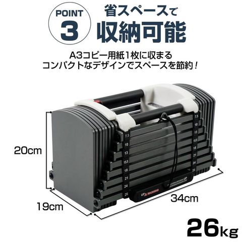 プレートの側面をフラットに設計しております。 また、素早い重量変更が可能なので、 「スーパーセット」「ドロップセット」などのハイレベルなトレーニングにも向いています。 ロックピンを、差すだけ。たった約3秒で重量変更が可能です。 コア(持ち手)の両サイドにあるプレートをロックピンで止めるだけの簡単構造なので、 ダイヤル式のように故障したりなどの心配がありません。 「可変の調子が悪い・・・」「コツがいる・・・」などのストレスがありません。 可変式ブロックなので、トレーニングジムに通わなくても様々なトレーニングが可能です。 ※こちらのページは、2個での販売となります。 【商品サイズ】 約26kg:約34cm×19cm×20cm | |