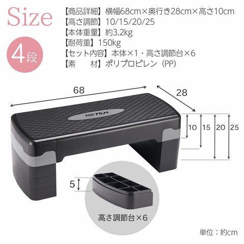 踏み台昇降 ステップ台 踏み台 昇降台 最大約25cm 4段 スローステップ ステッパー フィットネス 簡単 滑り止め 安全 【商品詳細】約横幅68cm×奥行き28cm×高さ10cm | |