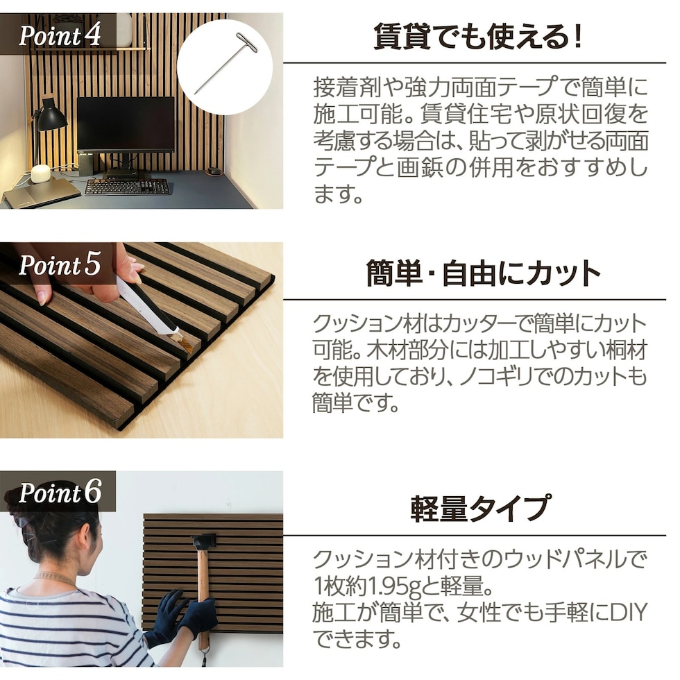 【商品仕様】 【吸音効果】 【木目調デザイン】 【安全な素材】 【簡単な取り付け】 【耐久性抜群で長持ち】 ※本商品は、素材の特性上、多少の小傷、歪みがある場合がございます。 | |