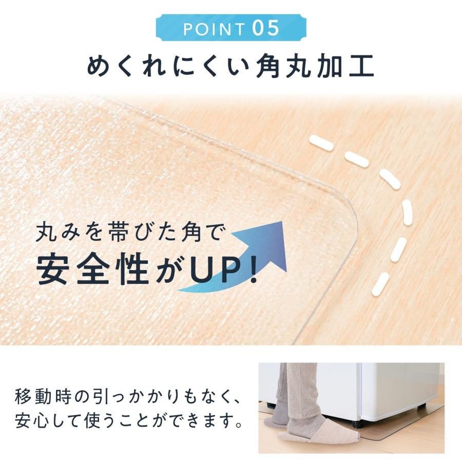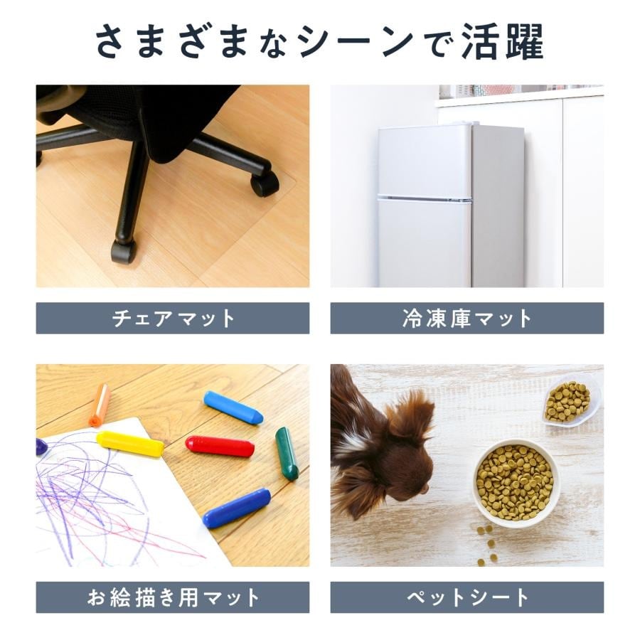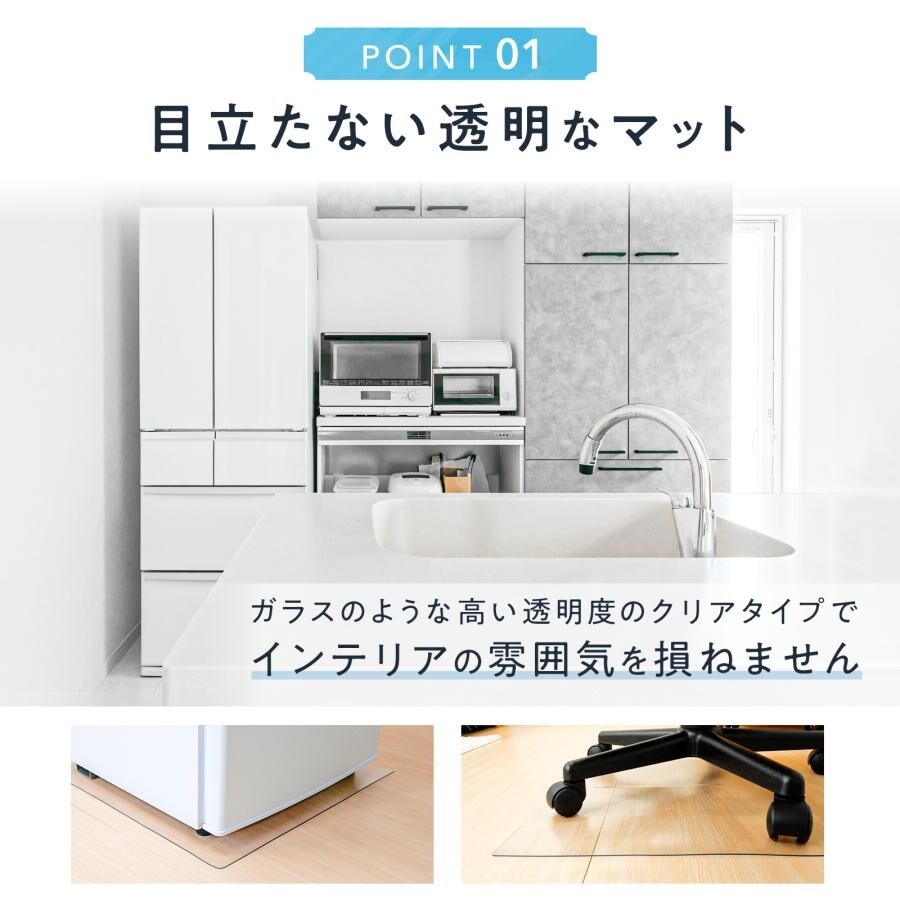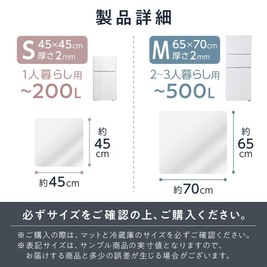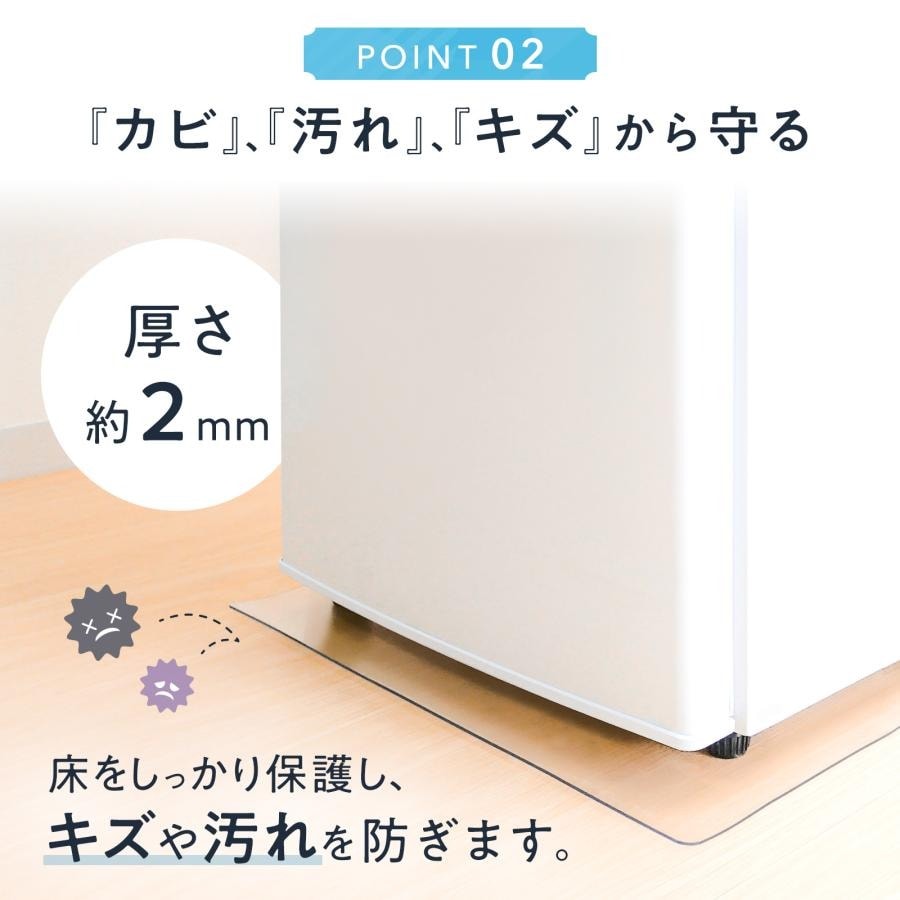 | 冷蔵庫マット クリアマット 床 保護 傷防止マット キッチン ダイニング クリア 抗菌 防カビ 防臭 厚さ 2mm 床暖房対応 爆買 冷蔵庫 下敷き マット シート 透明 撥水 耐熱 フローリング 凹み防止 キズ防止 床保護シート PVC エンボス加工 【冷蔵庫マットでダメージから守る!】 厚さ約2mmの厚みのあるシートで、 床ををしっかり保護し、凹み、キズ、汚れを防ぎます。 【目立たない透明なマット】 ガラスのような高い透明度のクリアタイプで、 インテリアの雰囲気を損ねません! 【こだわりの設計】 表面はエンボス加工で冷蔵庫のズレを防ぎます。 撥水性に優れたPVC素材で、水の拭き取りがカンタン! 防汚加工で汚れも拭き取りやすい! 【床暖房対応】 約70℃までOK!耐熱加工だから、 床暖房の上に設置しても大丈夫! 【サイズ】 ●Sサイズ:約45×45cm、厚さ約2mm(1人暮らし用、~200L) ※必ずサイズをご確認の上、ご購入下さい。 | |