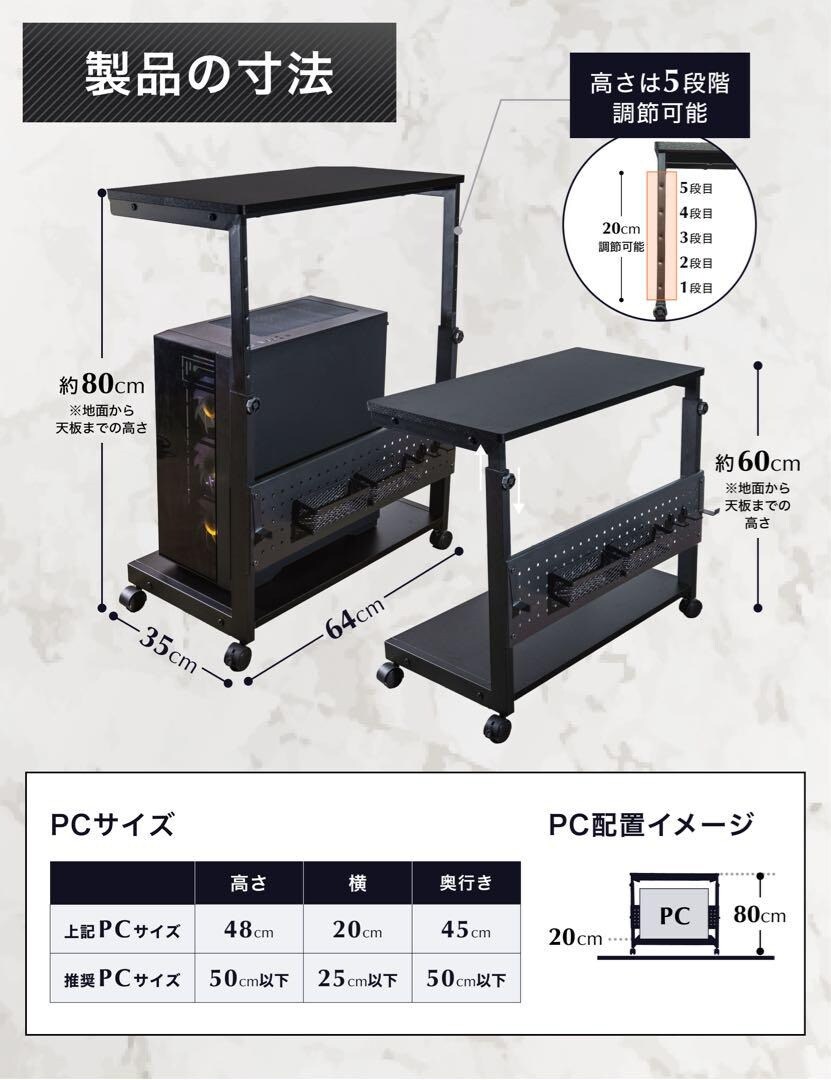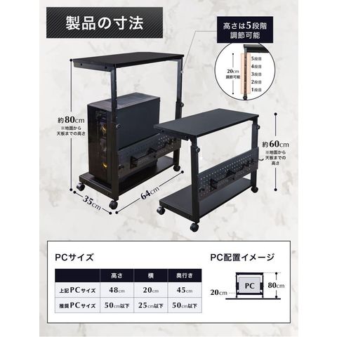 【寸法】本体サイズ:幅約35×奥行約64×高さ約60~80cm高さは5段で階調節可能。耐荷重:天板20kg、天板30kg 推奨のPCサイズ:高さ40cm、横25cm、奥行50cm以下のサイズのPC ※必ずご自宅のPCのサイズを確認してからご購入下さい。