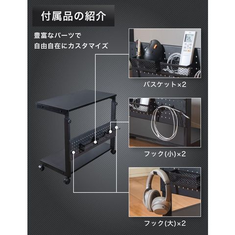 【豊富なカスタムアイテム】パンチングボードにはカスタマイズ可能なアイテムがついています。フック(大)×2フック小×2バスケット×2 全6種のアイテムをお好みで着脱して、自由自在にカスタマイズしましょう。ケーブルやヘッドセットを掛けるには最適です。