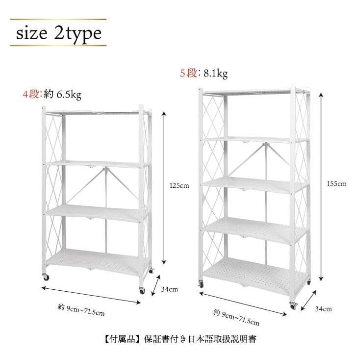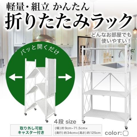 棚 収納 おしゃれ 白 ホワイト キッチン収納 幅 約71.5cm 高さ 約125cm 折り畳み ラック 4段 スリム スチール メタル 折りたたみ キャスター付き 軽量 送料無料 ※北海道、沖縄県、離島を除く 【ロジ発送】 トラベルソムリエ w-kagu1