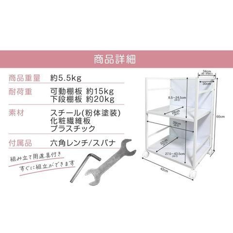 1. 生活感を隠す「目隠しデザイン」 背面と側面を覆うパネル付きで、収納物をスッキリ隠せる。生活感を抑え、お部屋がより上品でスタイリッシュに。 商品サイズ:約 幅42×奥行32×高さ60cm | |