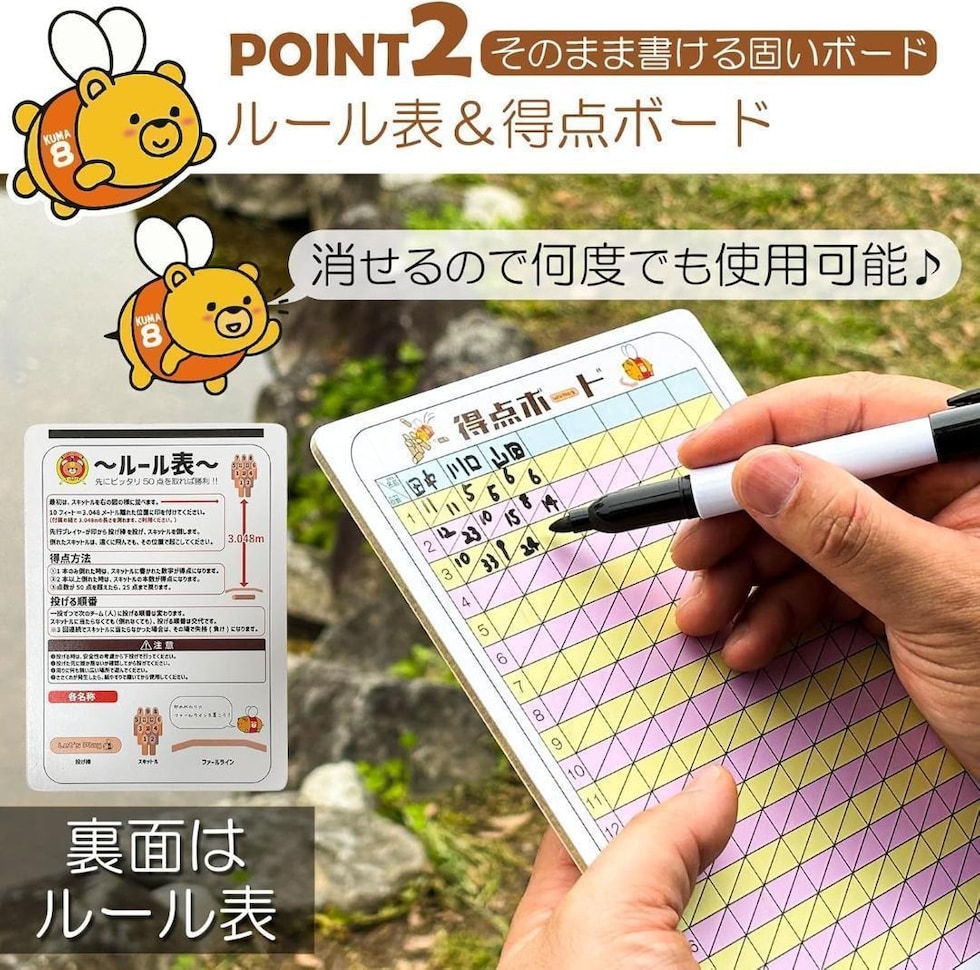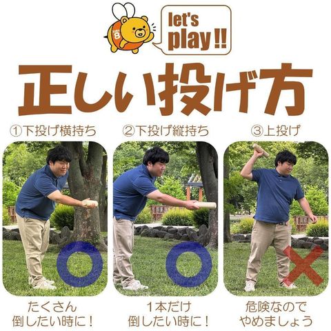 〇【基本の楽しみ方】投棒を投げ、スキットルを倒します。 スキットルを倒し、そのスキットルに印字された数字が獲得できたり、複数のスキットルを倒したり、スキットルの数と同等のポイントを獲得します。 めざせ50点!