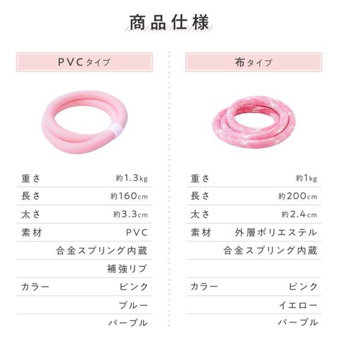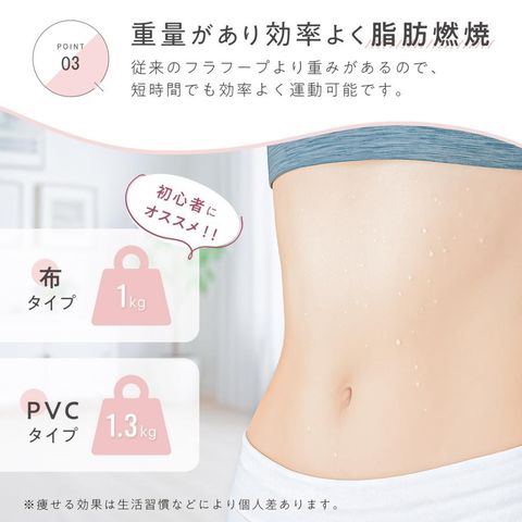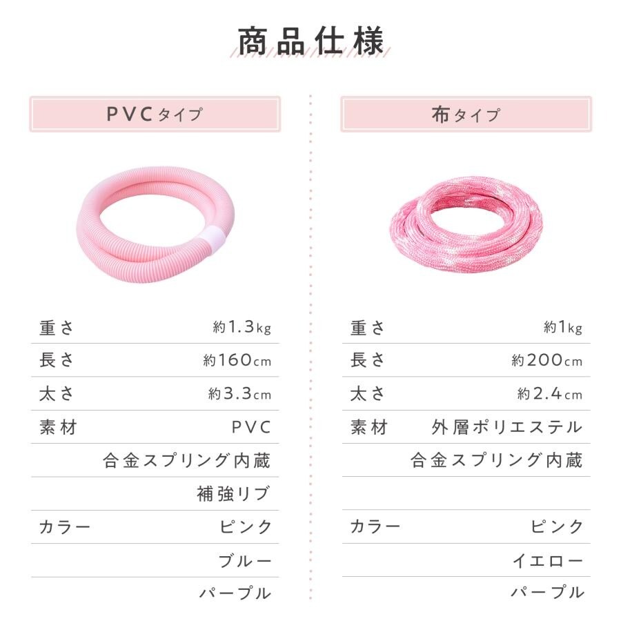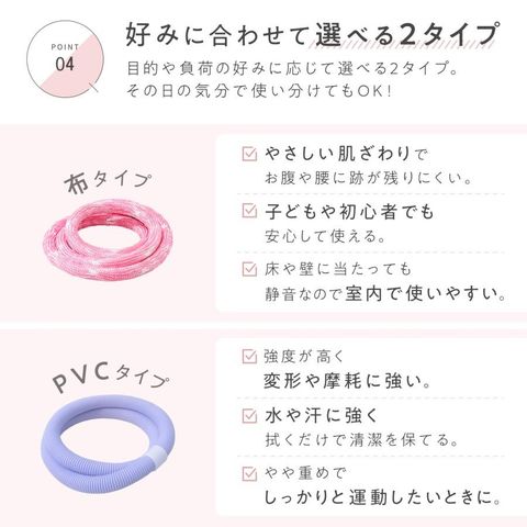 第4世代 ソフトフラフープ 折りたたみ 収納 スプリング 柔らかい コンパクト スマート 重い 静音設計 完全密閉式 回しやすい PVC 1kg 布 1.3kg 運動不足や姿勢・骨盤のゆがみが気になる方におすすめ。 髪や肌を挟まず、汚れにくい密閉設計でお手入れも簡単。 タイプは2種類。 静音設計だから、家族や隣室を気にせず使用可能。 ●PVCタイプ ●布タイプ | |