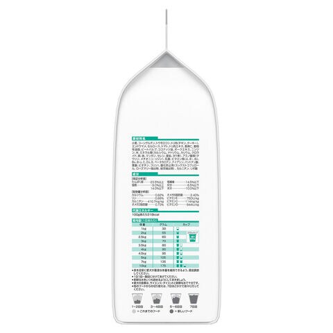 ■素材・材質:小麦、トリ肉(チキン、ターキー)、エンドウマメ、小麦グルテン、とうもろこし、セルロース、トマト、トリ肉エキス、動物性油脂、亜麻仁、ビートパルプ、ココナッツ油、ポークエキス、ニンジン、米、ミネラル類(カルシウム、ナトリウム、カリウム、クロライド、銅、鉄、マンガン、セレン、亜鉛、イオウ、ヨウ素)、アミノ酸類(タウリン、メチオニン、リジン)、乳酸、ビタミン類(A、B1、B2、B6、B12、C、D3、E、ベータカロテン、ナイアシン、パントテン酸、葉酸、ビオチン、コリン)、L-カルニチン、酸化防止剤(ミックストコフェロール、ローズマリー抽出物、緑茶抽出物)