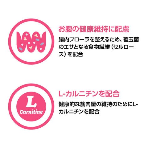 腸内フローラを整えるため、善玉菌のエサとなる食物繊維(セルロース)を配合。さらに消化吸収の負担が少ない小麦タンパク質分離物(消化率90%以上)、ジャスミンライスを使用し、猫のお腹の健康維持をサポートします。