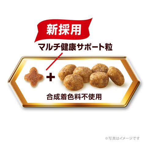 ■素材・材質:穀類(トウモロコシ、小麦粉、パン粉、玄米等)、魚介類(フィッシュミール、フィッシュエキス、小魚パウダー)、肉類(チキンミール、チキンエキス等)、豆類(大豆、大豆パウダー、大豆エキス)、動物性油脂、野菜類(ビートパルプ、ニンジンパウダー、カボチャパウダー、ホウレンソウパウダー)、酵母、糖類(ショ糖、オリゴ糖)、ミネラル類(カルシウム、塩素、コバルト、銅、鉄、ヨウ素、カリウム、マンガン、ナトリウム、亜鉛)、ビタミン類(A、B1、B2、B6、B12、C、D、E、K、コリン、ナイアシン、パントテン酸、ビオチン、葉酸)、ミルクカルシウム、酸化防止剤(ミックストコフェロール、ハーブエキス)
