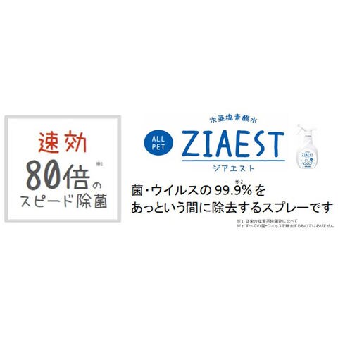 従来の塩素系除菌剤に比べて、80倍のスピードで菌・ウイルスを99.9%除去できるオールペット用の除菌・消臭剤。