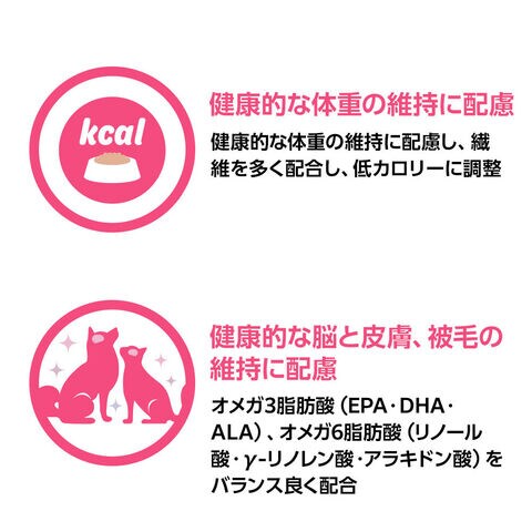 この食事は、避妊・去勢した犬の健康的な体重の維持に配慮し、カロリーを低く調整しています。
