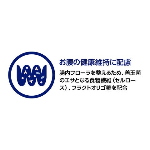 腸内フローラを整えるため、善玉菌のエサとなる食物繊維(セルロース)、フラクトオリゴ糖を配合。さらに消化吸収の負担が少ない小麦タンパク質分離物(消化率90%以上)、ジャスミンライスを使用し、犬のお腹の健康維持をサポートします。