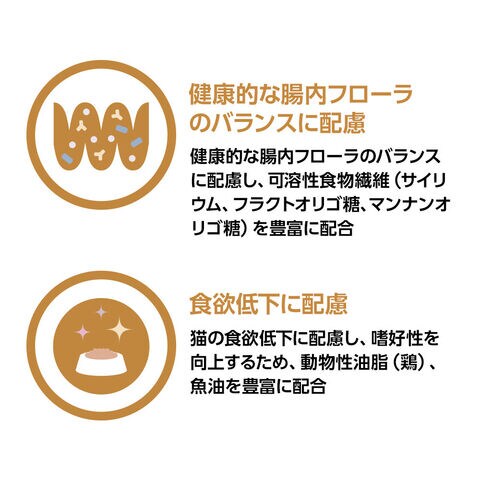 この食事は、下痢などの消化器疾患の猫に配慮し、高消化性の原材料を使用し、少ない給餌量でも、十分なエネルギーが摂取できるように調整されています。