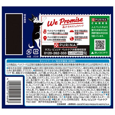 ■素材・材質:【ツナ&ほうれん草味】肉類(チキン、家禽ミール等)、小麦たんぱく、魚介類(ツナ等)、鶏脂(オメガ6脂肪酸源)、ぶどう糖、ほうれん草、アミノ酸類(タウリン)、ミネラル類(Ca、P、K、Na、Cl、Mg、Fe、Cu、Mn、Zn、I)、増粘多糖類、カラメル色素、ビタミン類(A、D、E、K、B1、B2、パントテン酸、ナイアシン、B6、葉酸、ビオチン、B12、コリン)【サーモン&トマト味】肉類(チキン、家禽ミール等)、小麦たんぱく、魚介類(サーモン等)、トマト、ぶどう糖、鶏脂(オメガ6脂肪酸源)、アミノ酸類(タウリン)、増粘多糖類、ミネラル類(Ca、P、K、Na、Cl、Mg、Fe、Cu、Mn、Zn、I)、カラメル色素、ビタミン類(A、D、E、K、B1、B2、パントテン酸、ナイアシン、B6、葉酸、ビオチン、B12、コリン)【あじ&ほうれん草味】肉類(チキン、ラム、家禽ミール等)、小麦たんぱく、魚介類(あじ等)、鶏脂(オメガ6脂肪酸源)、ぶどう糖、ほうれん草、アミノ酸類(タウリン)、ミネラル類(Ca、P、K、Na、Cl、Mg、Fe、Cu、Mn、Zn、I)、増粘多糖類、ビタミン類(A、D、E、K、B1、B2、パントテン酸、ナイアシン、B6、葉酸、ビオチン、B12、コリン)
