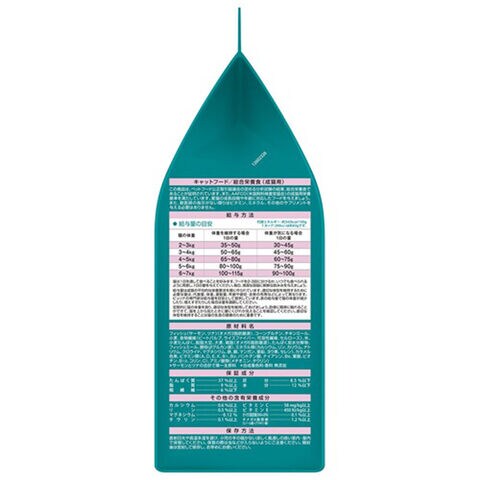 ■素材・材質:フィッシュ(サーモン、ツナ)(オメガ3脂肪酸源)、コーングルテン、 チキンミール、小麦、 食物繊維(ビートパルプ、ライスファイバー、可溶性繊維、セルロース)、米、 小麦たんぱく、 脱脂大豆、大麦、 鶏脂(オメガ6脂肪酸源)、たんぱく加水分解物、フィッシュミール、酵母(βグルカン源)、ミネラル類(カルシウム、リン、カリウム、ナトリウム、クロライド、マグネシウム、鉄、銅、マンガン、亜鉛、ヨウ素、セレン)、カラメル色素、ビタミン類(A、D、E、K、B1、B2、パントテン酸、ナイアシン、B6、葉酸、ビオチン、B12、コリン、C)、アミノ酸類(メチオニン、タウリン)