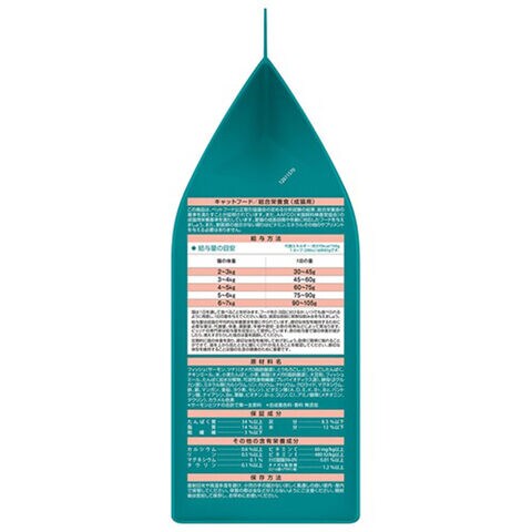 ■素材・材質:フィッシュ(サーモン、ツナ)(オメガ3脂肪酸源)、とうもろこし、とうもろこしたんぱく、チキンミール、米、小麦たんぱく、小麦、鶏脂(オメガ6脂肪酸源)、大豆粉、フィッシュミール、たんぱく加水分解物、可溶性食物繊維(プレバイオティクス源)、酵母(βグルカン源)、ミネラル類(カルシウム、リン、カリウム、ナトリウム、クロライド、マグネシウム、鉄、銅、マンガン、亜鉛、ヨウ素、セレン)、ビタミン類(A、D、E、K、B1、B2、パントテン酸、ナイアシン、B6、葉酸、ビオチン、B12、コリン、C)、アミノ酸類(メチオニン、タウリン)、カラメル色素