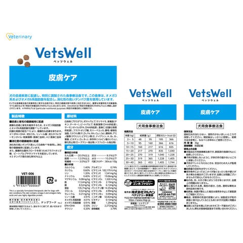 「VetsWell 皮膚ケア」は犬の皮膚疾患に配慮し、特別に調製された食事療法食です。