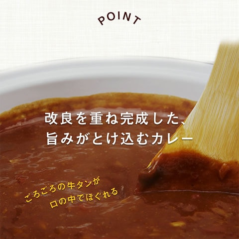 | 原材料名 | 牛たん(アメリカ)、カレールウ(牛脂豚脂混合油脂、小麦粉、ソテー・ド・オニオン、カレー粉、食塩、砂糖、焙煎香辛料、バナナフレーク、フォン・ド・ボーソース、脱脂粉乳、ソースパウダー、乳糖、チキンブイヨン、ブドウ糖)、玉ねぎ発酵調味料、香辛料/カラメル色素、調味料(アミノ酸等)、酸味料、香料、(一部に小麦・乳成分・牛肉・大豆・鶏肉・バナナ・りんごを含む) |