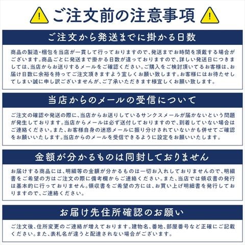 | 返品について | 出荷の際は品質管理に万全を期しておりますが、お届けした商品に万一不良品やお気付の点がございましたらお手数ではございますがメールもしくは電話にて、商品到着後5日以内に弊社までご連絡お願い致します。すぐに返品・交換をさせていただきます。返品商品到着確認後7~10日以内に当社より発送させて頂きます。また、原則としてお客様のご都合での返品・キャンセルは一切受け付けしておりません。何卒、ご了承くださいますようお願い致します。 |